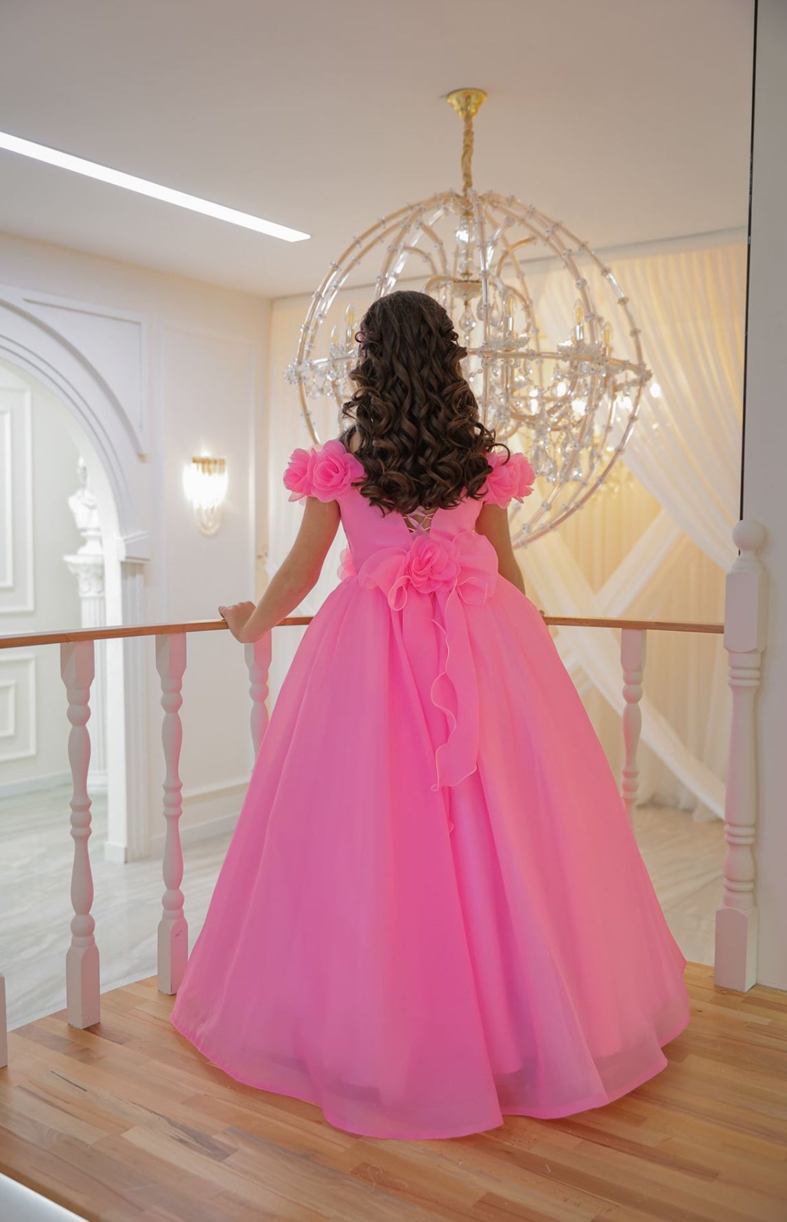 The 3D floral details extending from the shoulders to the waist, along with the layered tulle skirt, create a fairytale-like volume, while the graceful bow at the back adds a romantic finishing touch. 👑