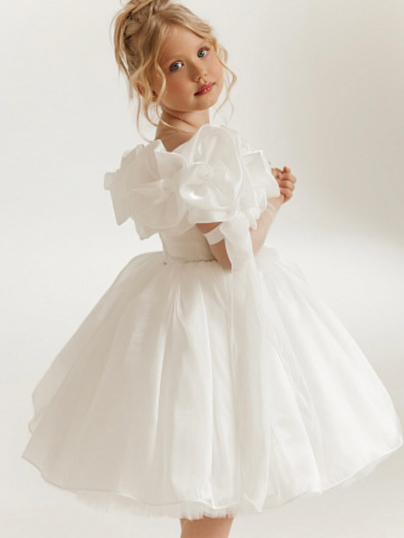 A timeless princess silhouette brought to life with dreamy puffy sleeves and soft layered tulle. This dress features a matching head accessory and a removable tulle sleeve, delicately tied on the upper arm with a satin bow for an extra touch of elegance. The tulle sleeve can be worn or removed, offering flexibility for both classic and dramatic styles. ✨