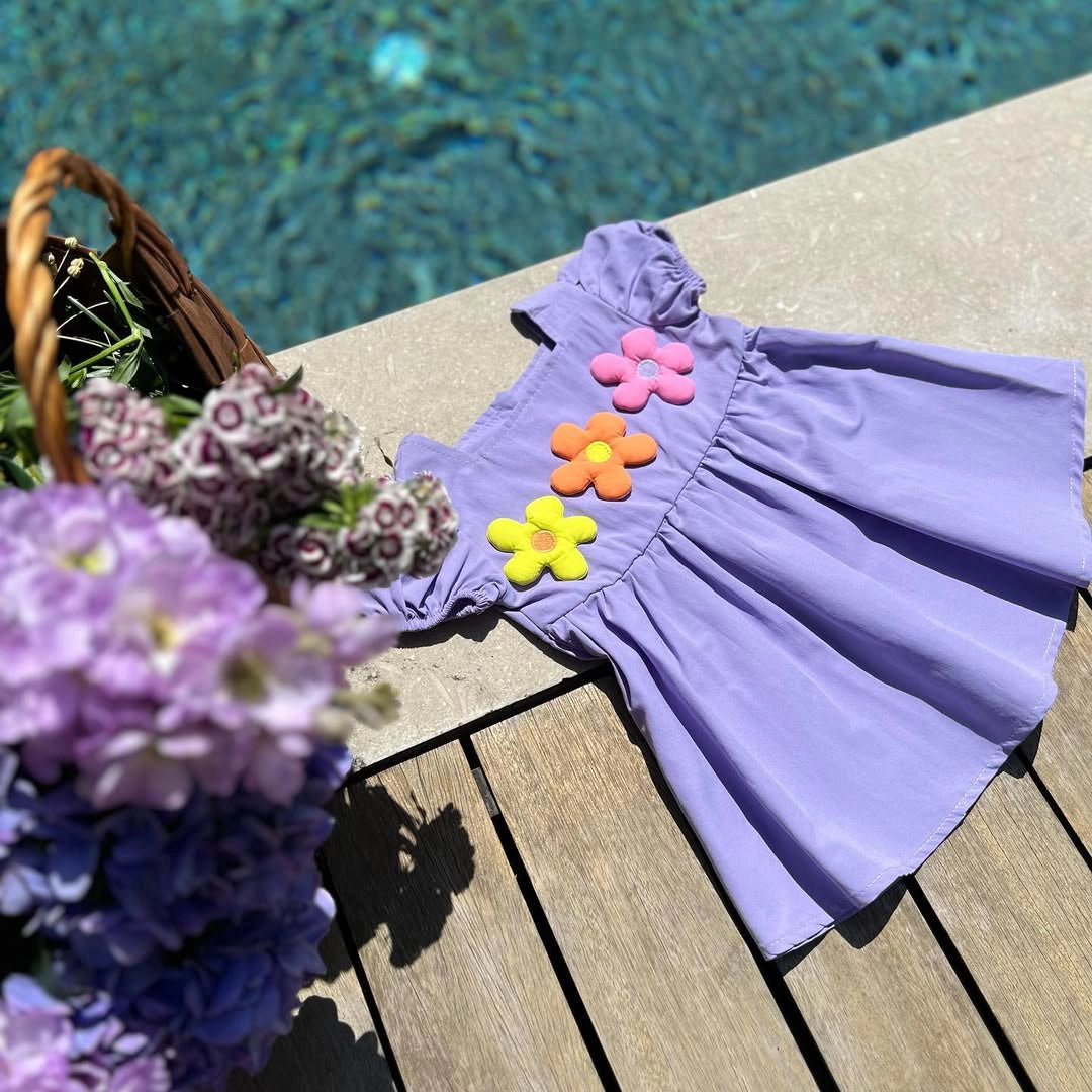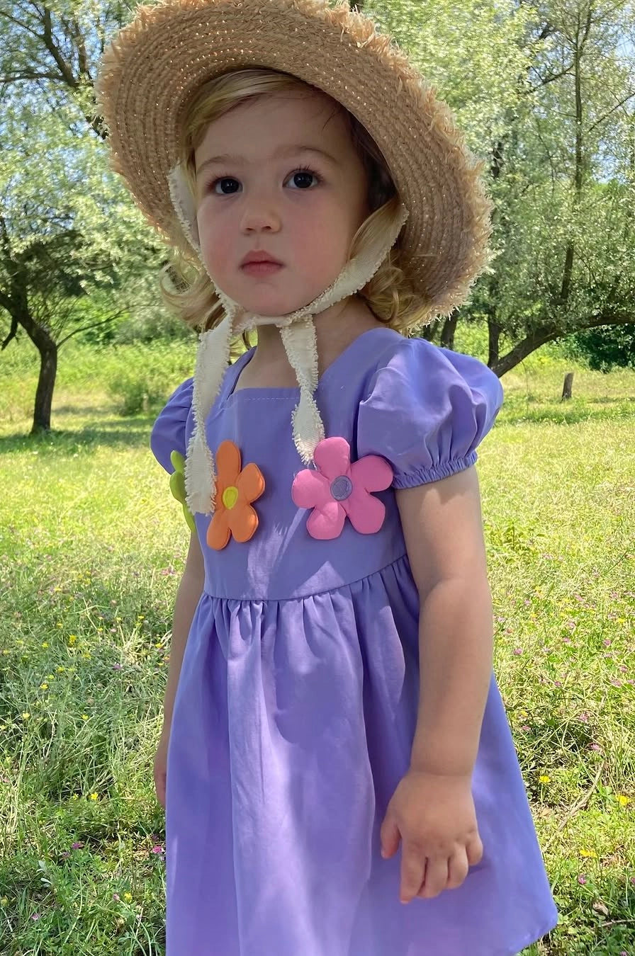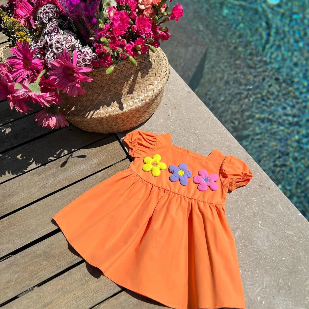 With its cheerful colors and adorable floral details, the Blossom Garden Dress is designed for little princesses! Made from soft, breathable fabric with a puff-sleeve silhouette, it’s both comfortable and eye-catching. Available in vibrant purple and orange, this dress brings the energy of summer to life. The three-dimensional floral appliqués on the front add a playful and dreamy touch, making it perfect for little ones who love to shine. 3D floral appliqués for a fun and charming look Lightweight and breathable fabric for all-day comfort. %100 Cotton Fabric, %100 Cotton Lining. Paired with a tulle bow headband accessory. Puff-sleeve design for a sweet and elegant style Perfect for birthday parties, spring outings, picnics, and special moments Lovingly Made in Turkey💜
