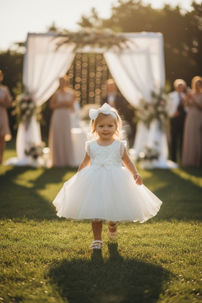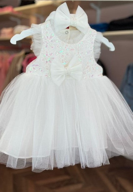 This enchanting dress is designed to make little princesses shine in their most special moments! With its pearl and sequin embroidered bodice, voluminous tulle skirt, and elegant bow embellishment, it offers a truly dazzling look.