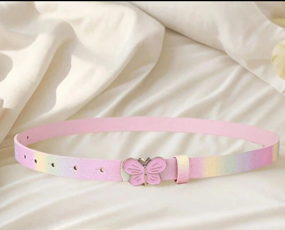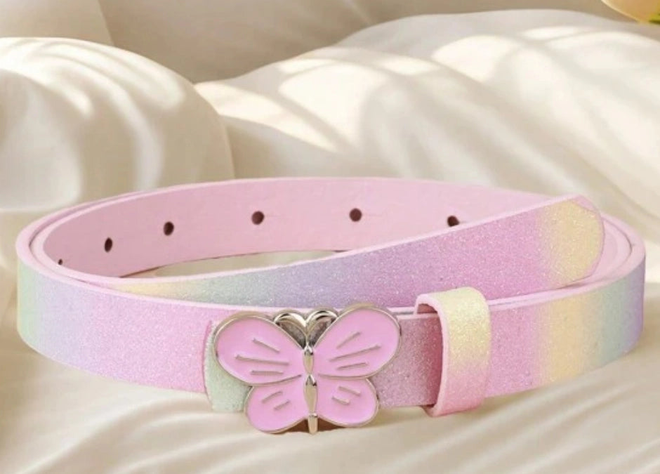 Adjustable shoulder strap Shimmery, glitter-coated surface Perfect size for everyday use Magnetic flap with butterfly accent Belt Features: Shiny rainbow effect Pink butterfly buckle design Adjustable fit with multiple holes Easily pairs with dresses, skirts, or jeans This sparkling accessory set is the perfect way to add fun and flair to any outfit from birthday parties to casual days out! You can check the belt size in the size chart.