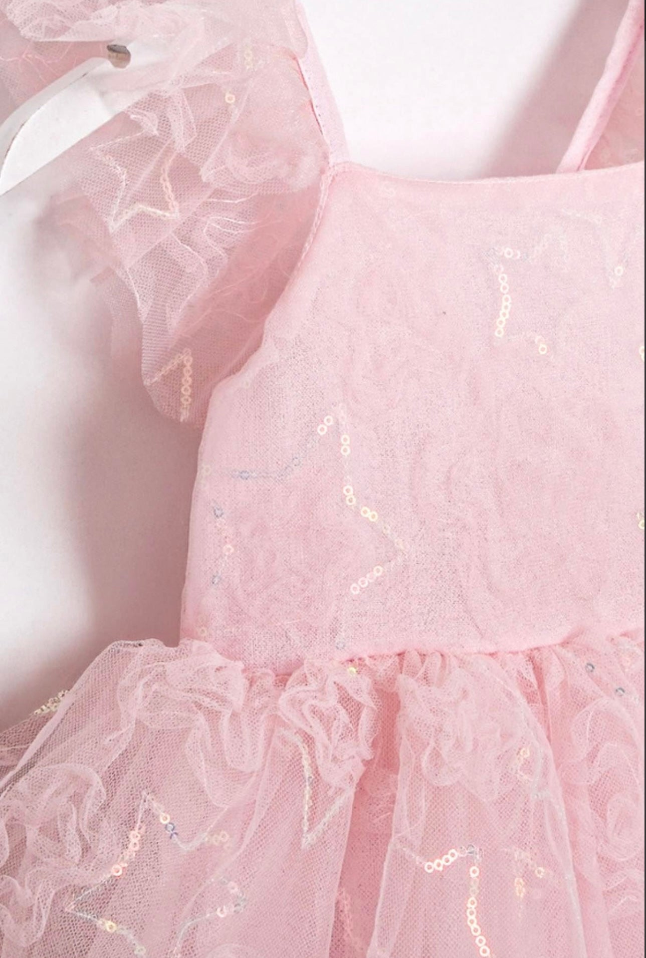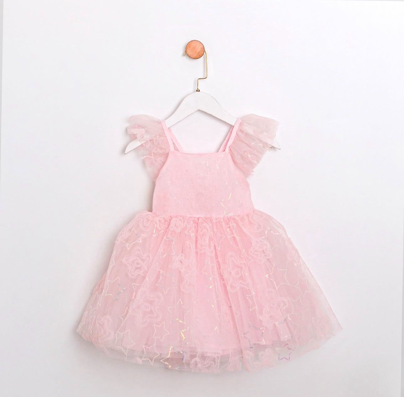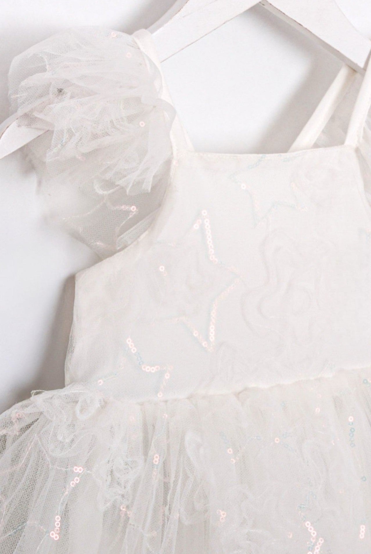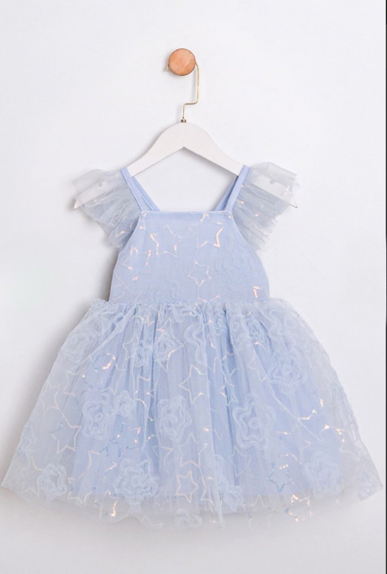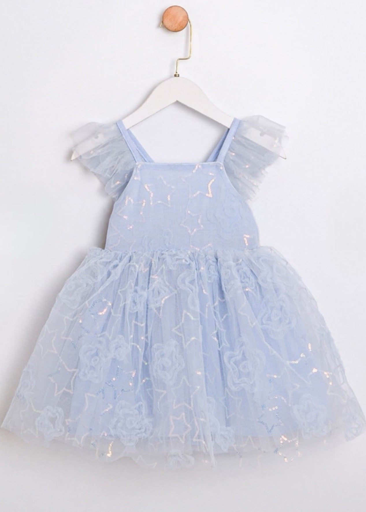 🌟 Adorned with shimmering stars and romantic floral patterns, this enchanting dress is a dazzling choice for my little princesses! With its frilly shoulder details and airy tulle skirt, the design offers a magical silhouette with every twirl perfect for birthday parties, stage performances, weddings, and special photo shoots. With its 100% cotton lining, it ensures comfort all day long. Our dresses are true to size; we recommend choosing based on age.
