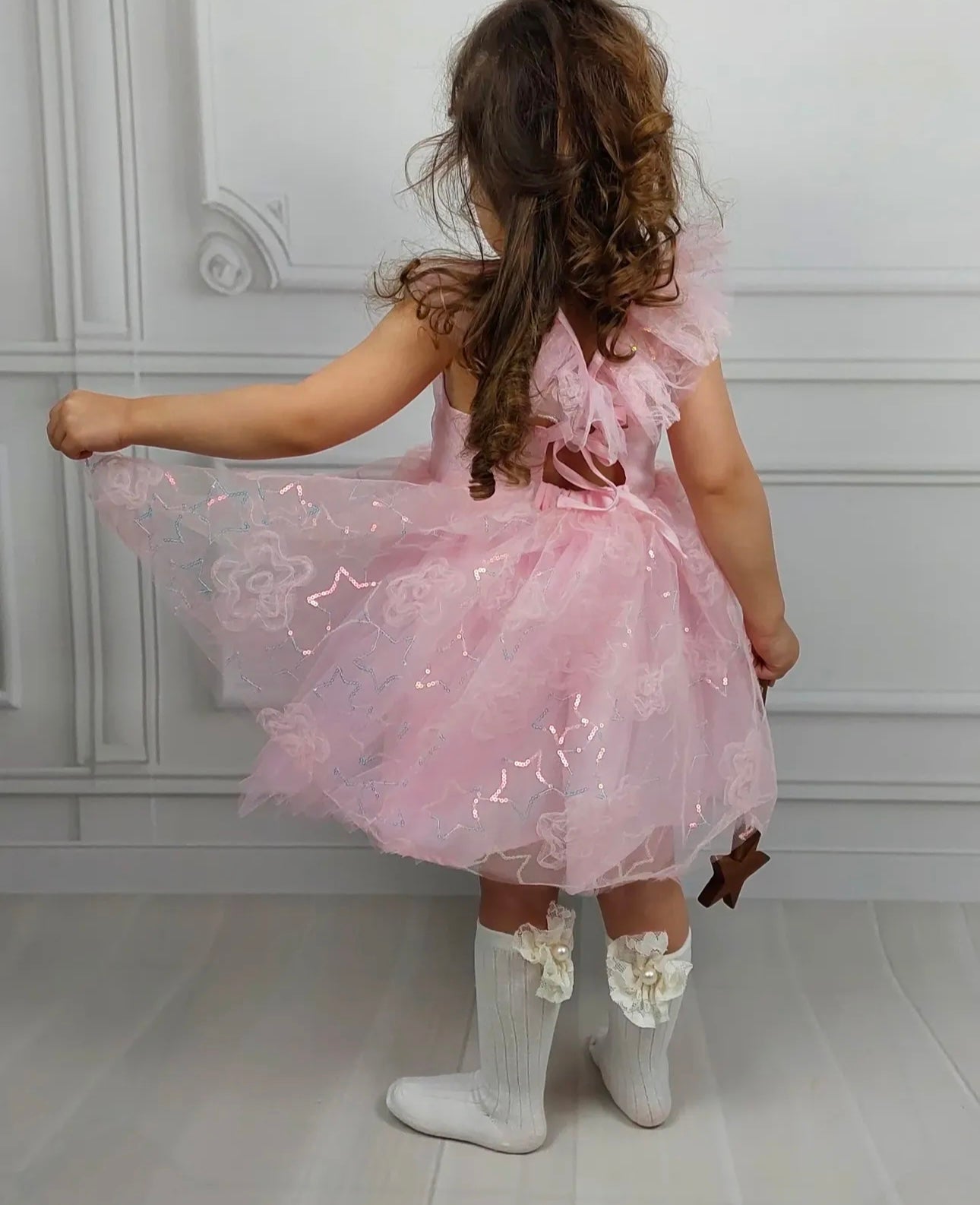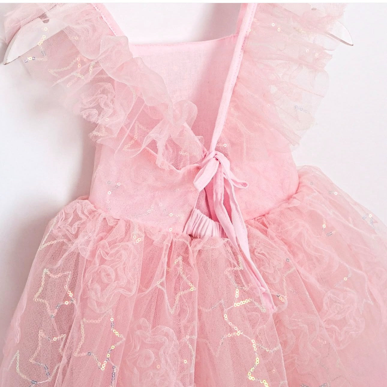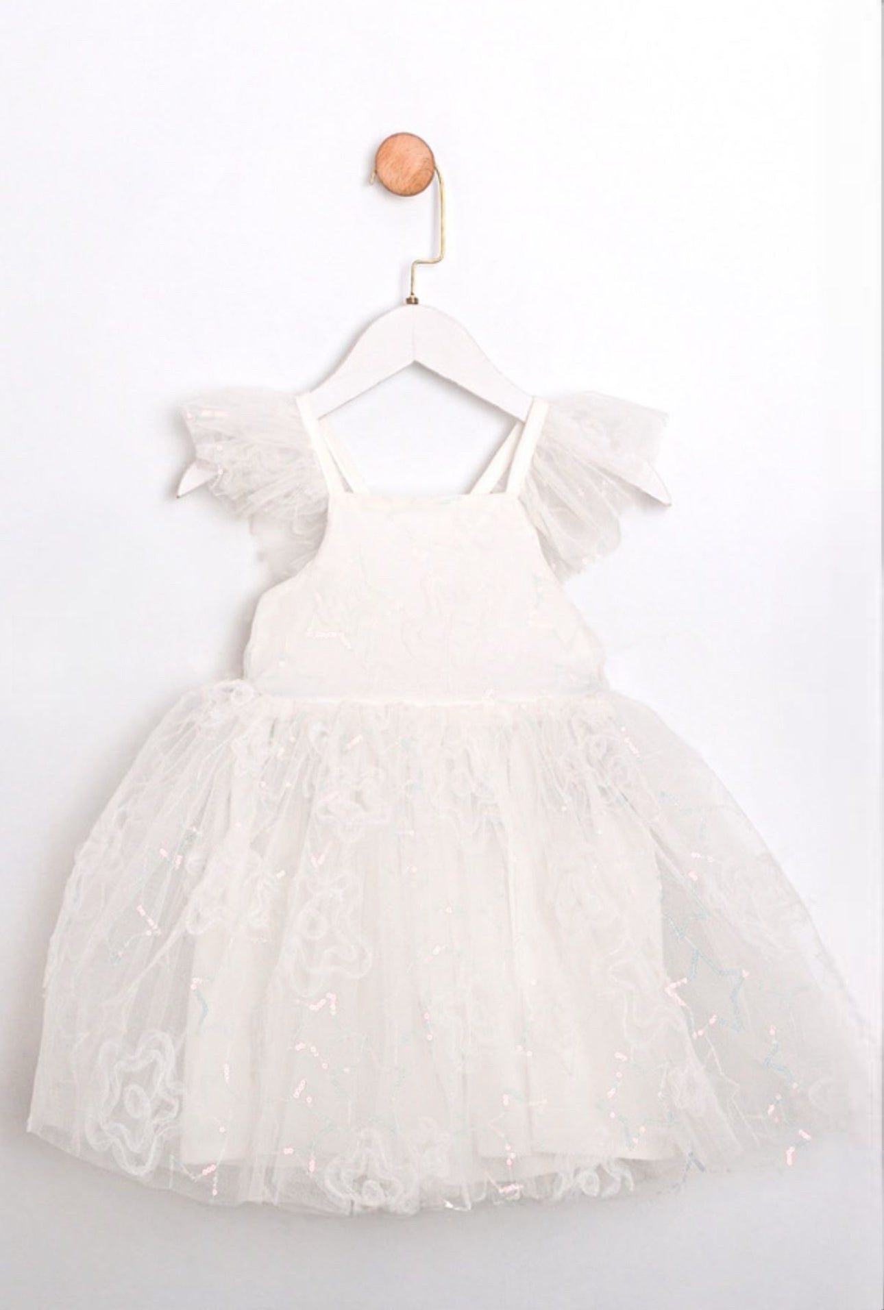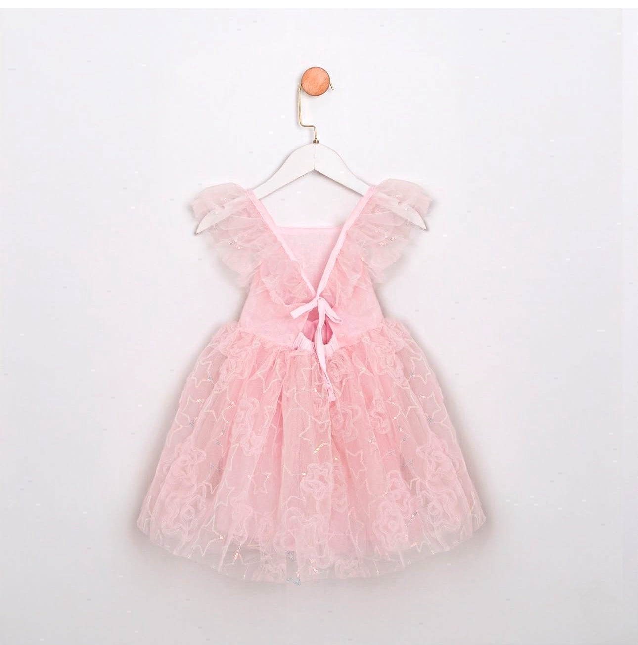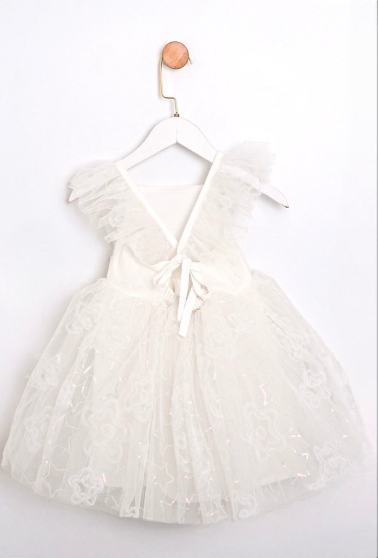 🌟 Adorned with shimmering stars and romantic floral patterns, this enchanting dress is a dazzling choice for my little princesses! With its frilly shoulder details and airy tulle skirt, the design offers a magical silhouette with every twirl perfect for birthday parties, stage performances, weddings, and special photo shoots. With its 100% cotton lining, it ensures comfort all day long. Our dresses are true to size; we recommend choosing based on age.