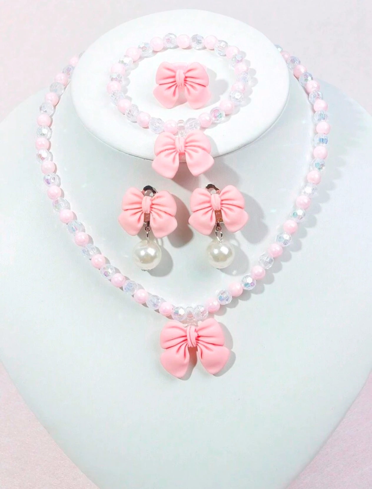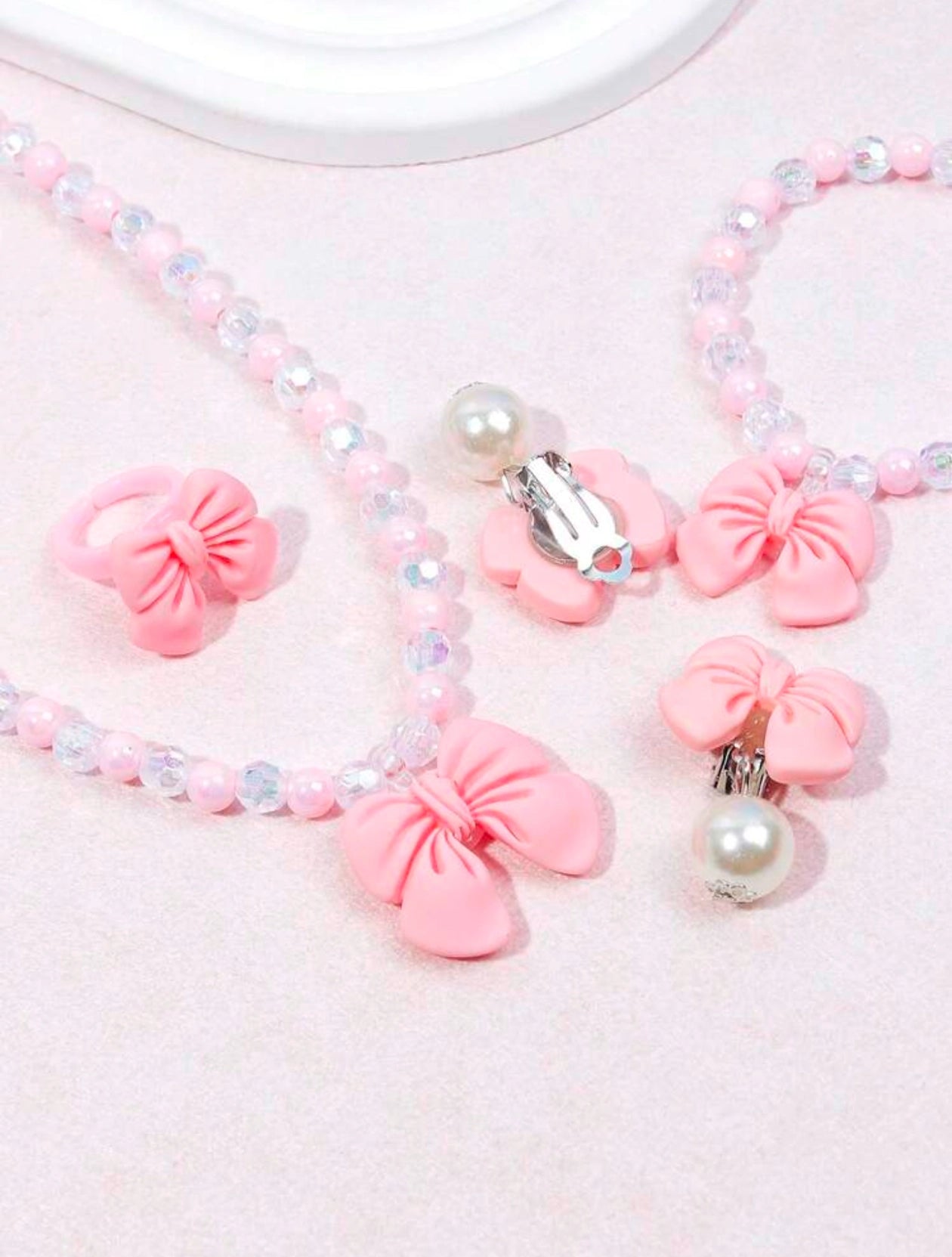 CUTE PINK BOW EARRINGS RINGS BEADED NECKLACE BRACELET JEWELRY 5 PIECE SET SUITABLE FOR PARTIES BIRTHDAY DAILY WEAR