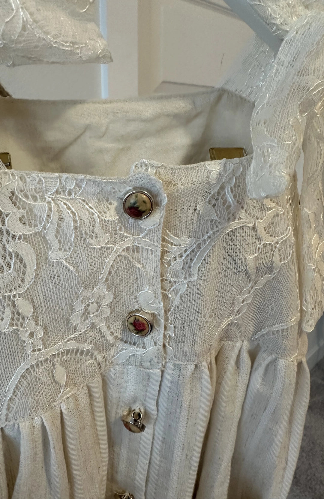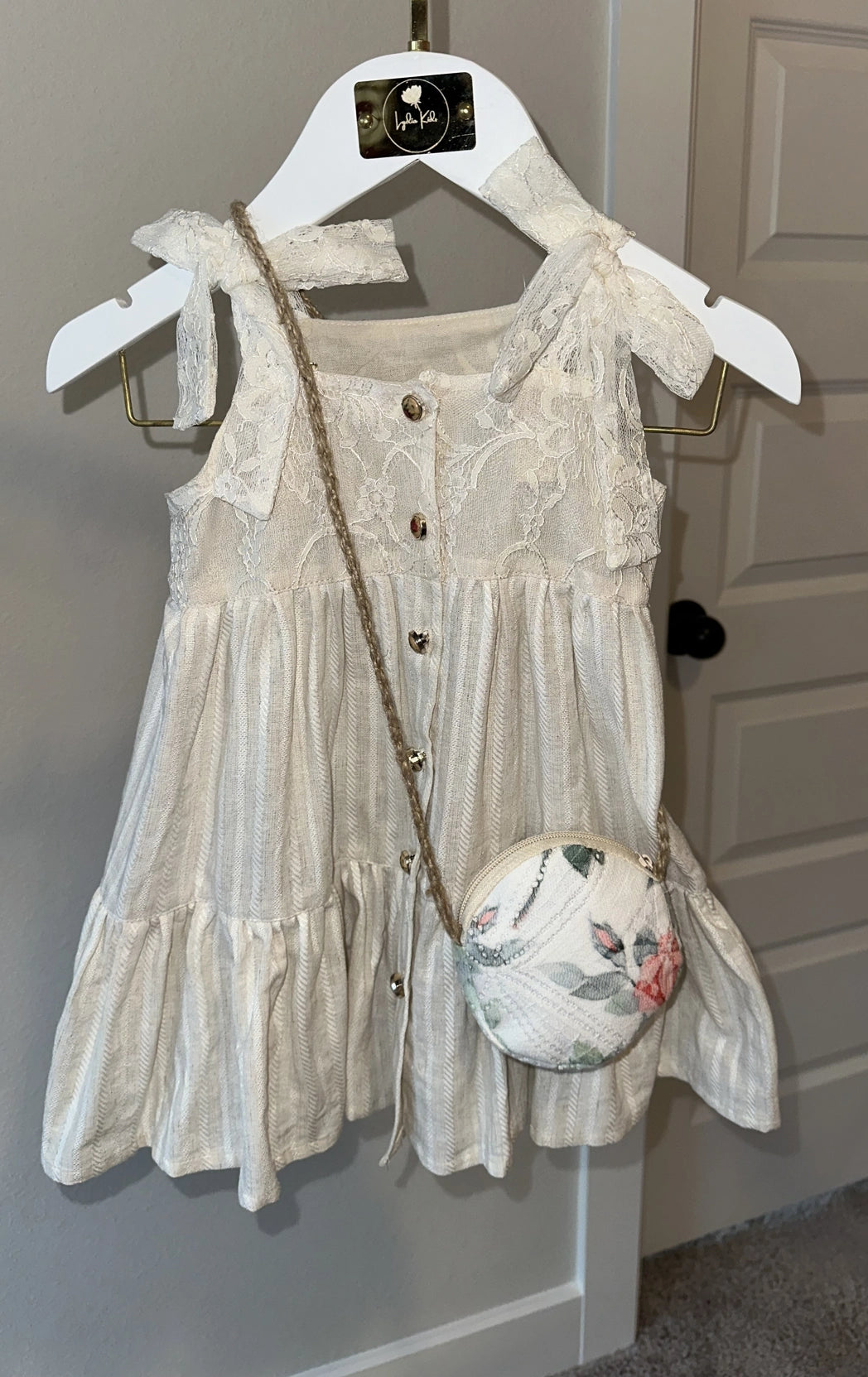 💖 A chic dress with lace details, thin straps, and button-down design, A matching mini bag with the same floral pattern as the buttons, Lightweight and breathable fabric for all-day comfort, A romantic and elegant design, perfect for special occasions and everyday elegance.