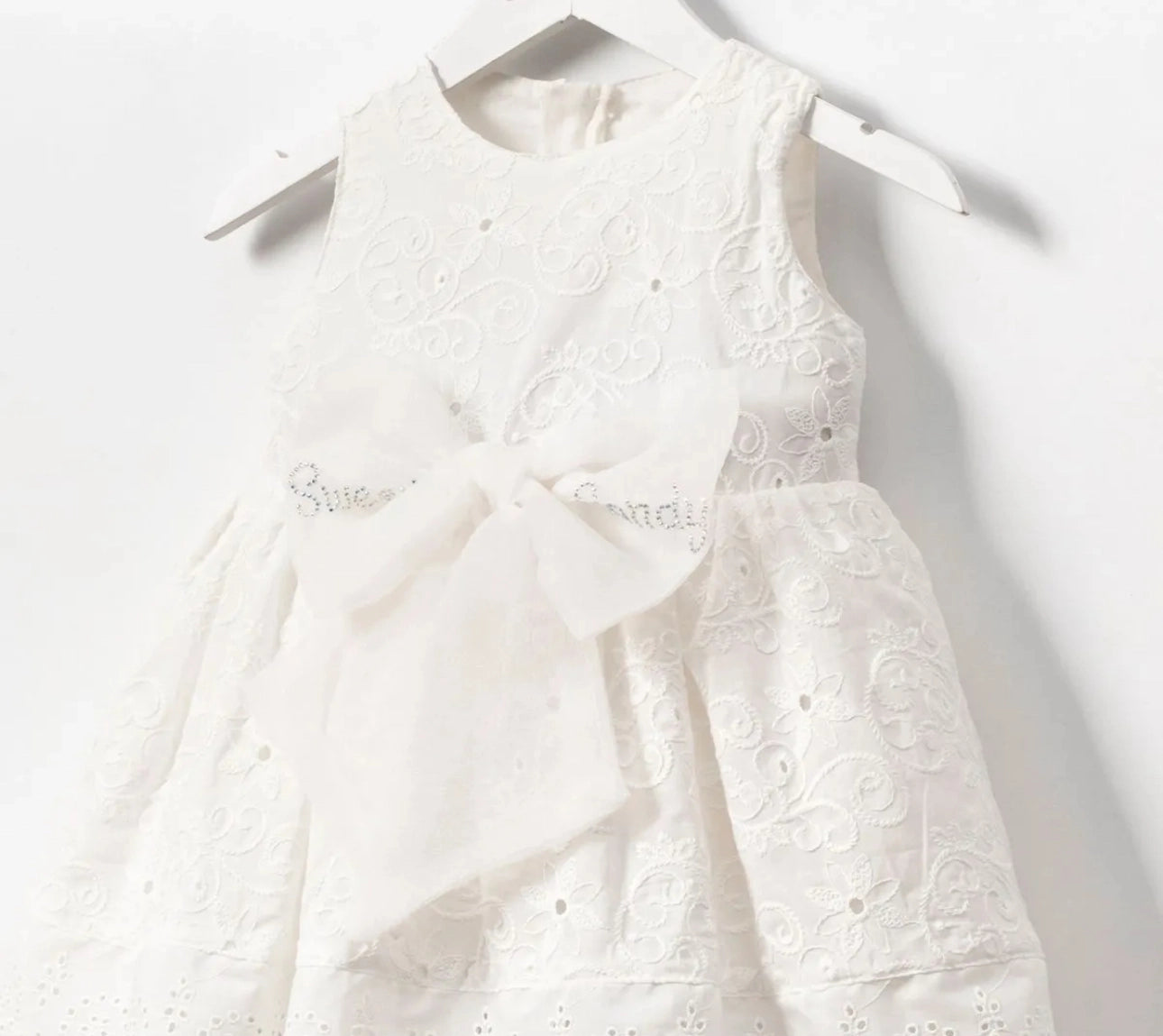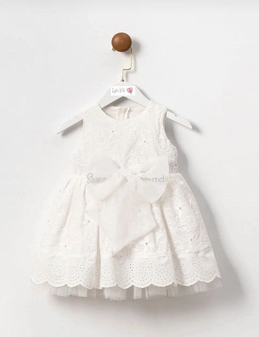 Our special embroidered fabric dress captivates with its delicate tulle bow at the waist and sparkling crystal embellishments. The layered tulle lining adds volume, creating a dreamy, fairy-tale look. With its 100% cotton lining, it ensures all-day comfort. Lovingly made in Turkey, this dress is a perfect choice for special occasions, celebrations, and unforgettable moments!