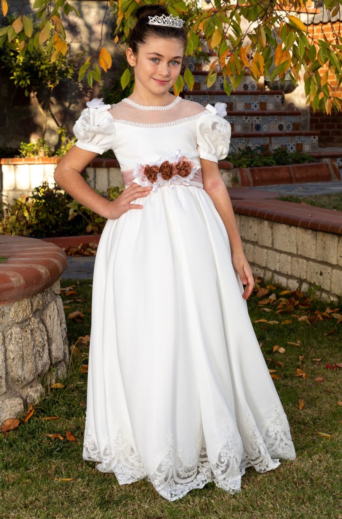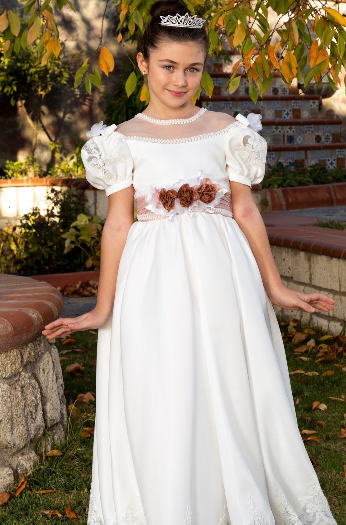 EMBROIDERED TRIM ACCESSORY NECKLINE BEADED 3D FLOWER WAIST WITH PINK BELT WEDDING RELIGIOUS CEREMONY BIRTHDAY SPECIAL OCCASION COMMUNION DRESS