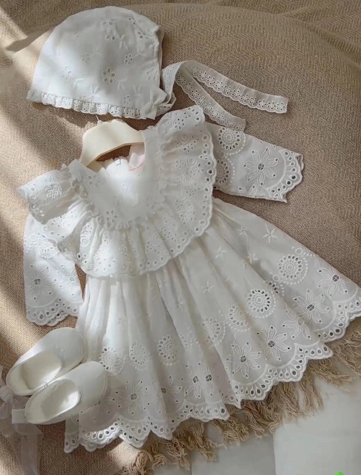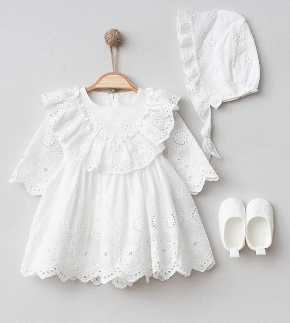 🕊️ Symbolizing innocence and purity, the delicately embroidered white fabric consists of three pieces. Crafted with special care and meticulous stitching, it dazzles with its elegance and is completed with a matching bonnet and booties. Made of soft 100% cotton eyelet fabric, this heirloomoutfit is available in 0-3M, 3-6M sizes. It is perfect for baptisms, birthdays, special family gatherings, Easter, Mother's Day, and any otherspecial occasion. Suitable for all seasons. Knee-length, long sleeves, and a unique collar design, An extended back with a special bow, Double-layered with an inner lining of 100% cotton.