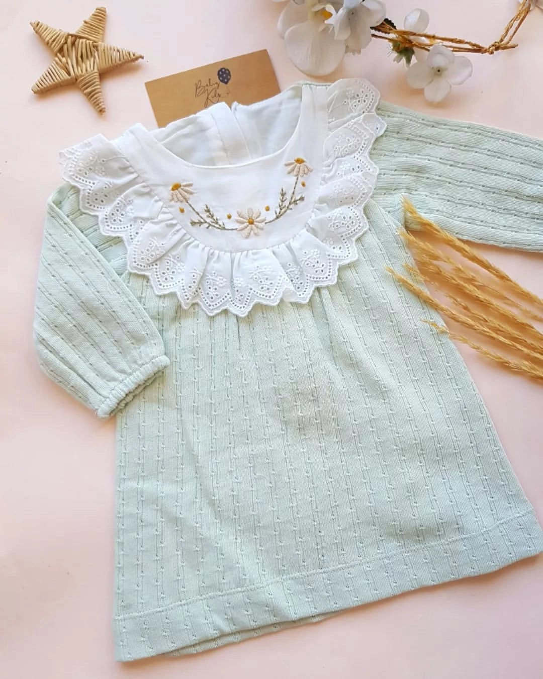 This adorable dress, designed for our little babies, is made to capture tiny hearts. With its delicate floral embroidery and elegant broderie details, it is the sweetest reflection of romance.