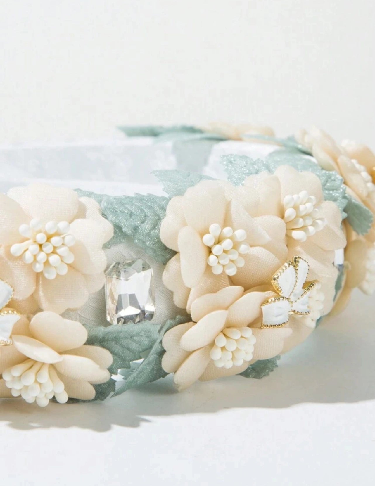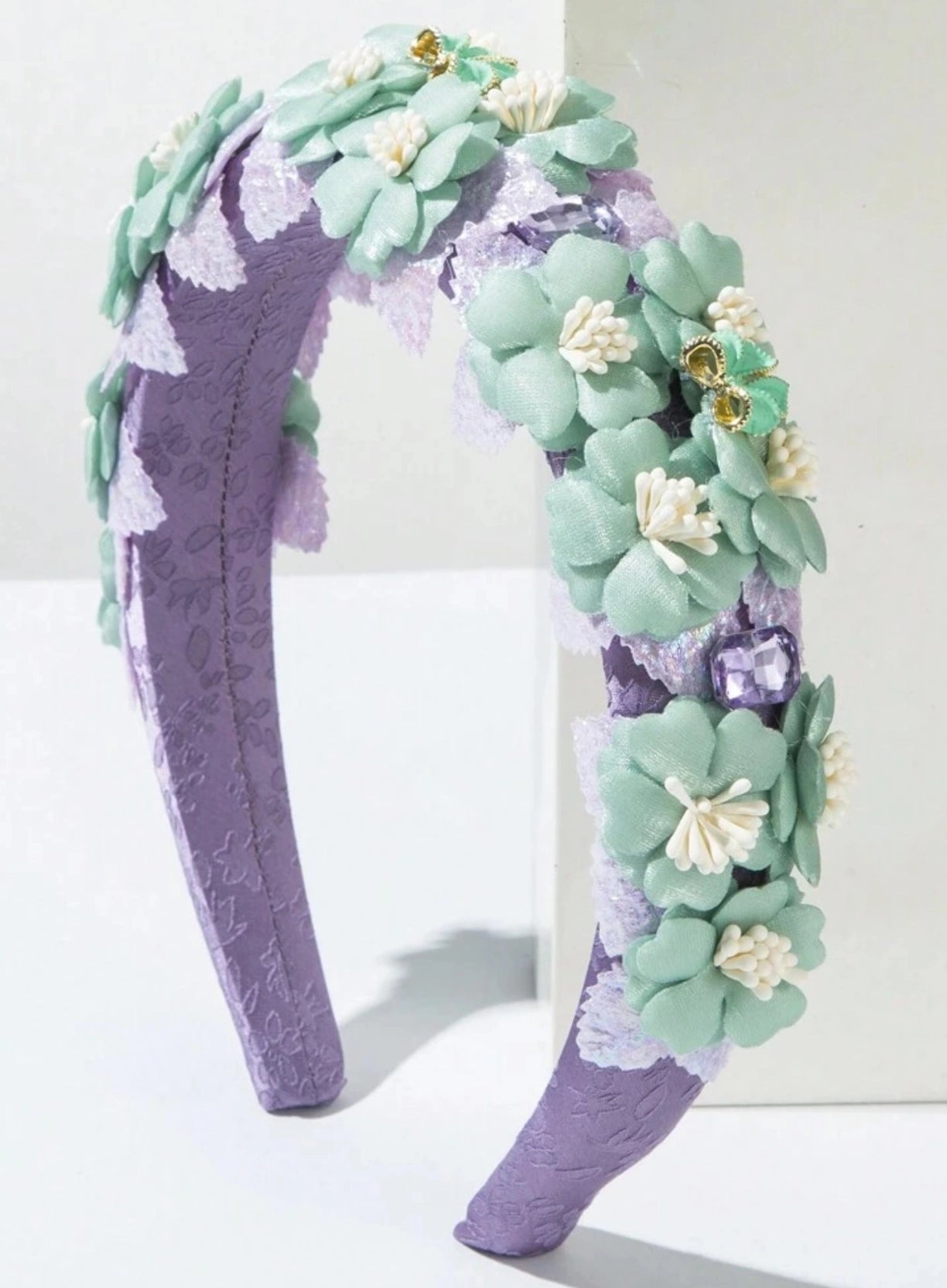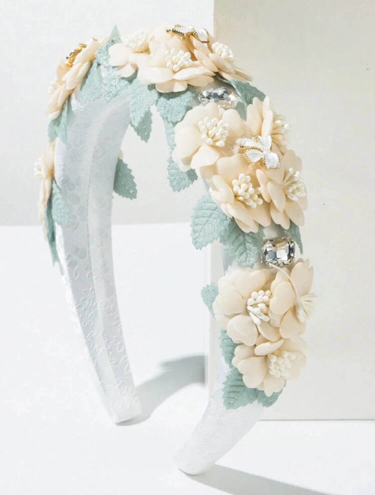 3D floral and leaf embellishments Sparkling crystal accents and butterfly details Soft fabric-covered structure – comfortable and durable Color options: Lavender & Mint / Cream & Aqua Ideal for birthdays, weddings, baptisms, and photo shoots