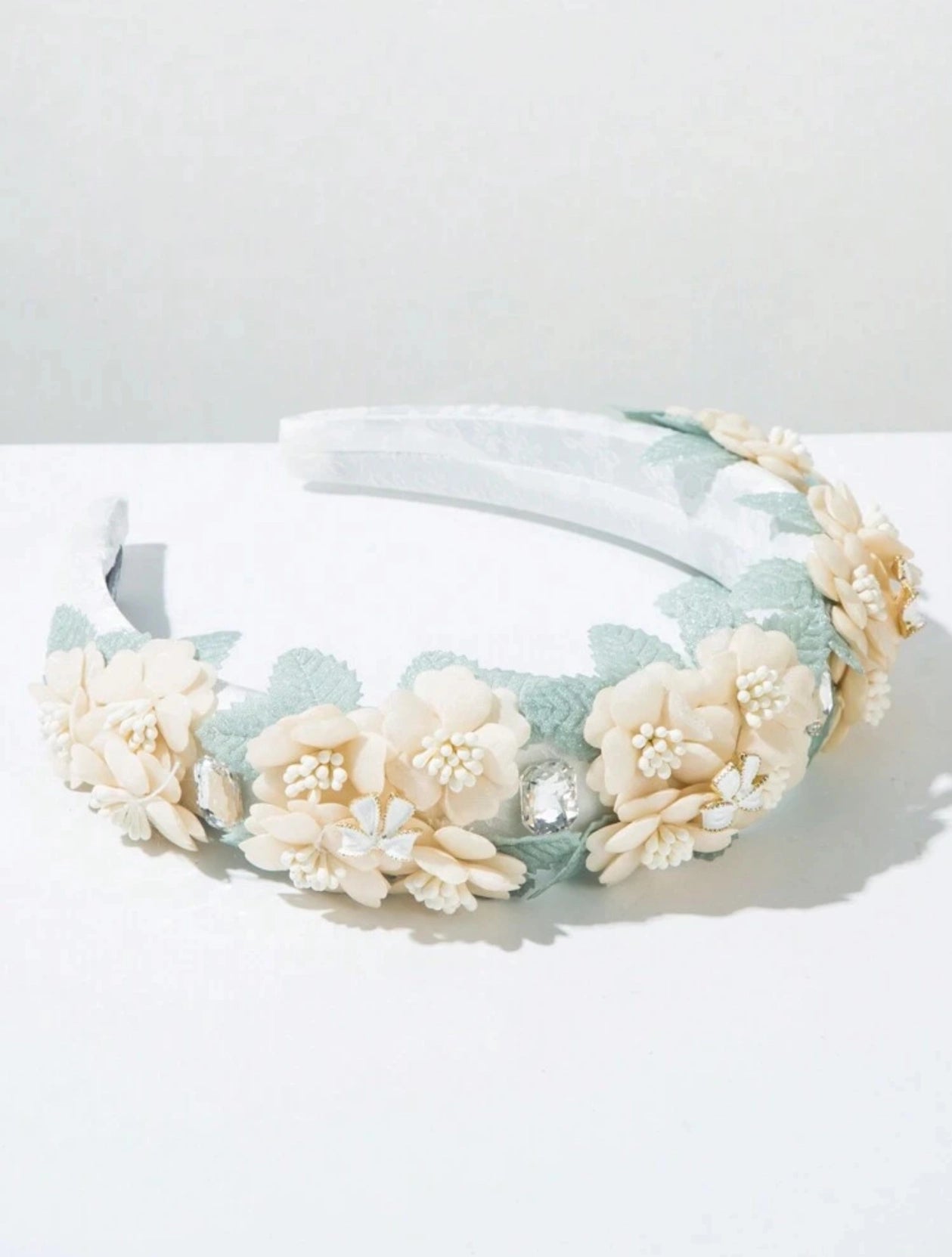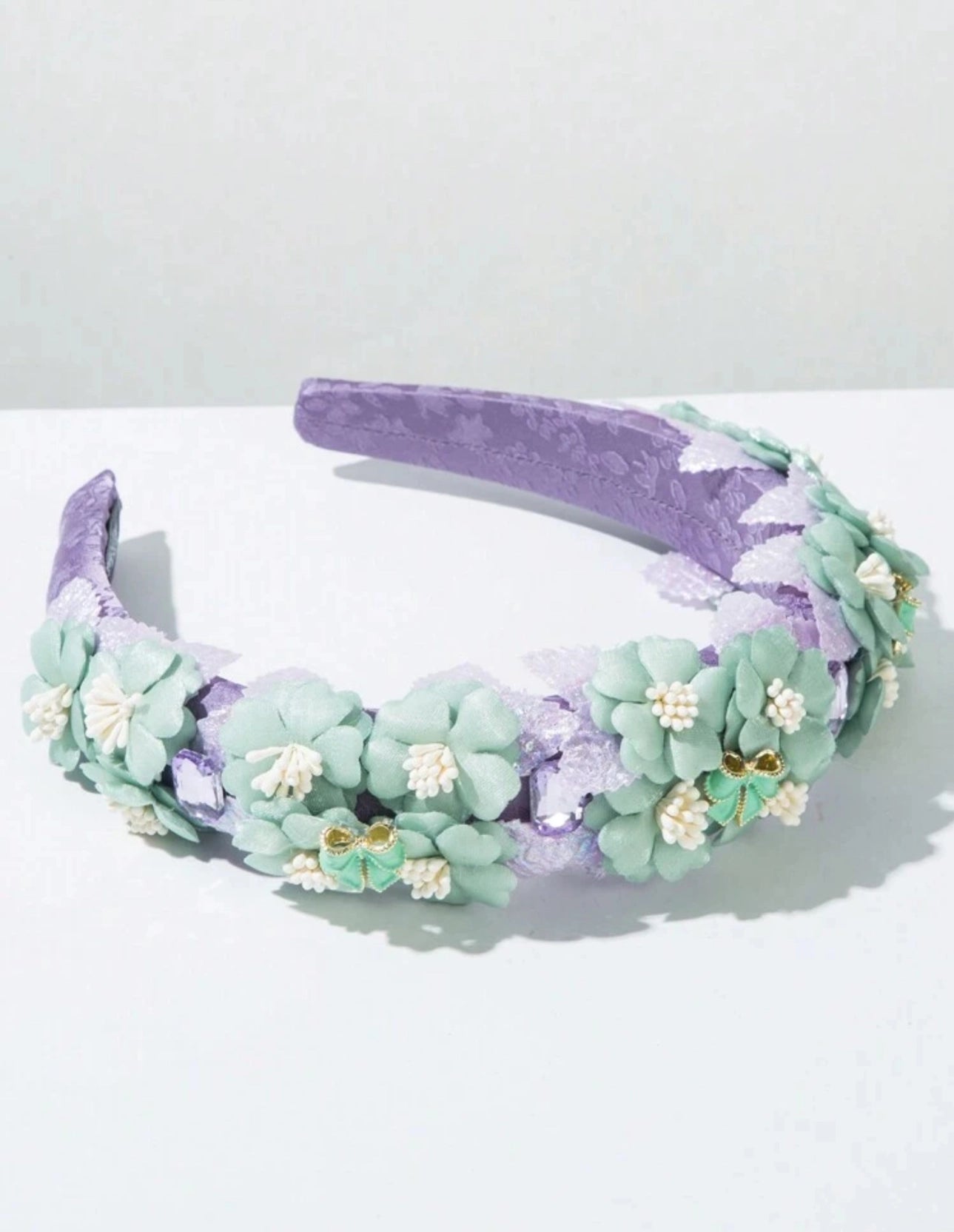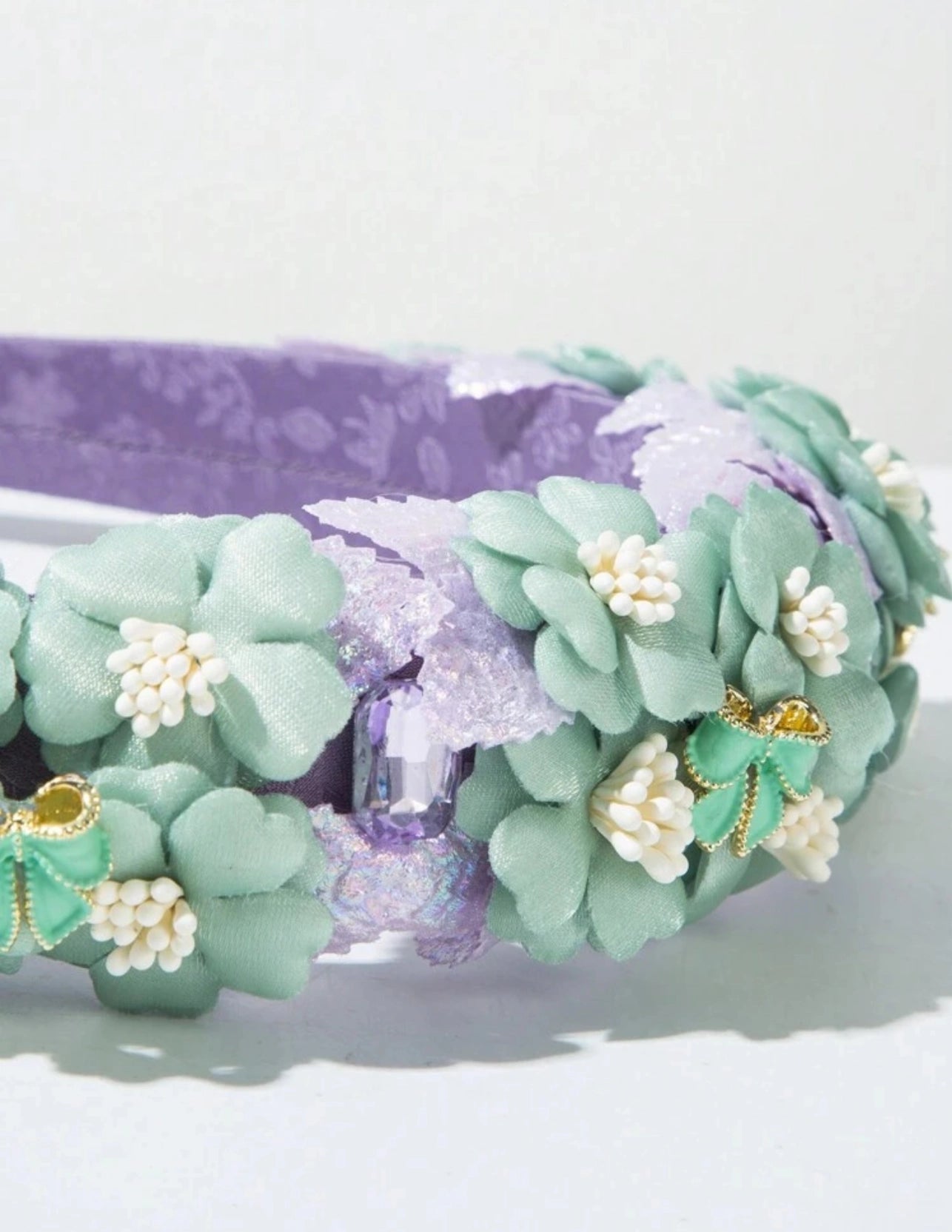 3D floral and leaf embellishments Sparkling crystal accents and butterfly details Soft fabric-covered structure – comfortable and durable Color options: Lavender & Mint / Cream & Aqua Ideal for birthdays, weddings, baptisms, and photo shoots