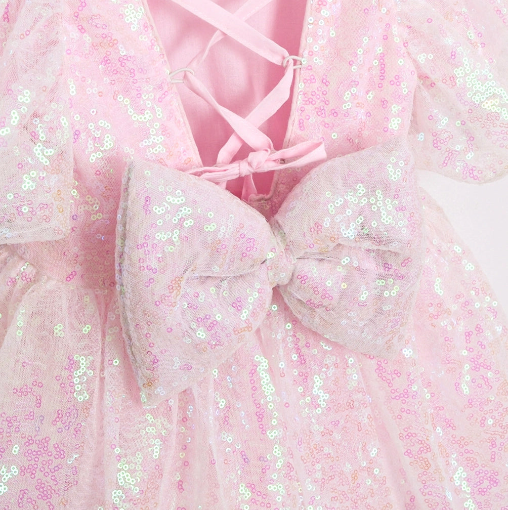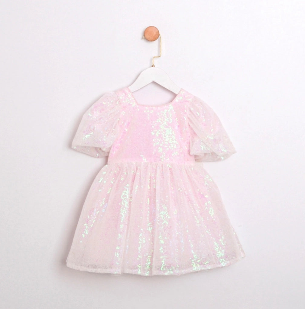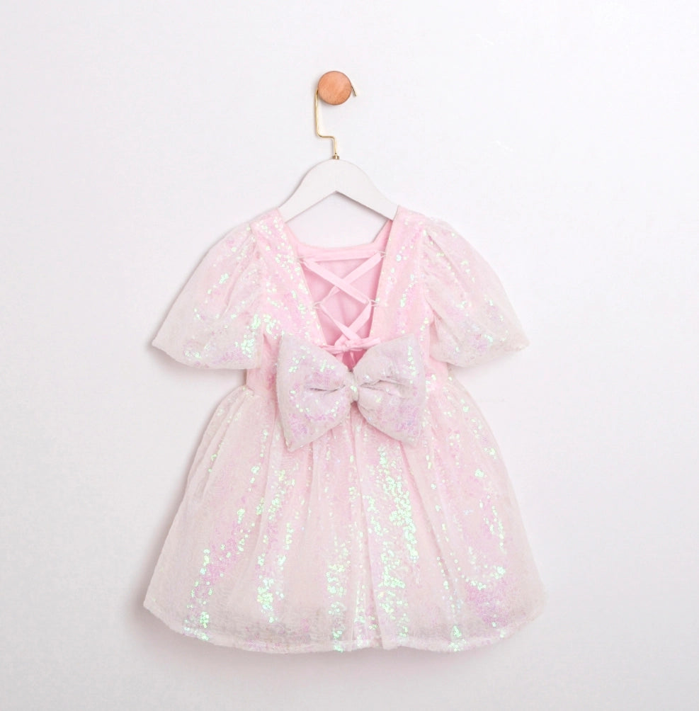 🩰 Glitter Dream – Sparkling Pink Girls' Dress The dance of sparkle and elegance comes to life in this stunning dress! With color-shifting sequins that catch the light and a stylish lace-up back detail, this piece is every little princess’s dream come true.