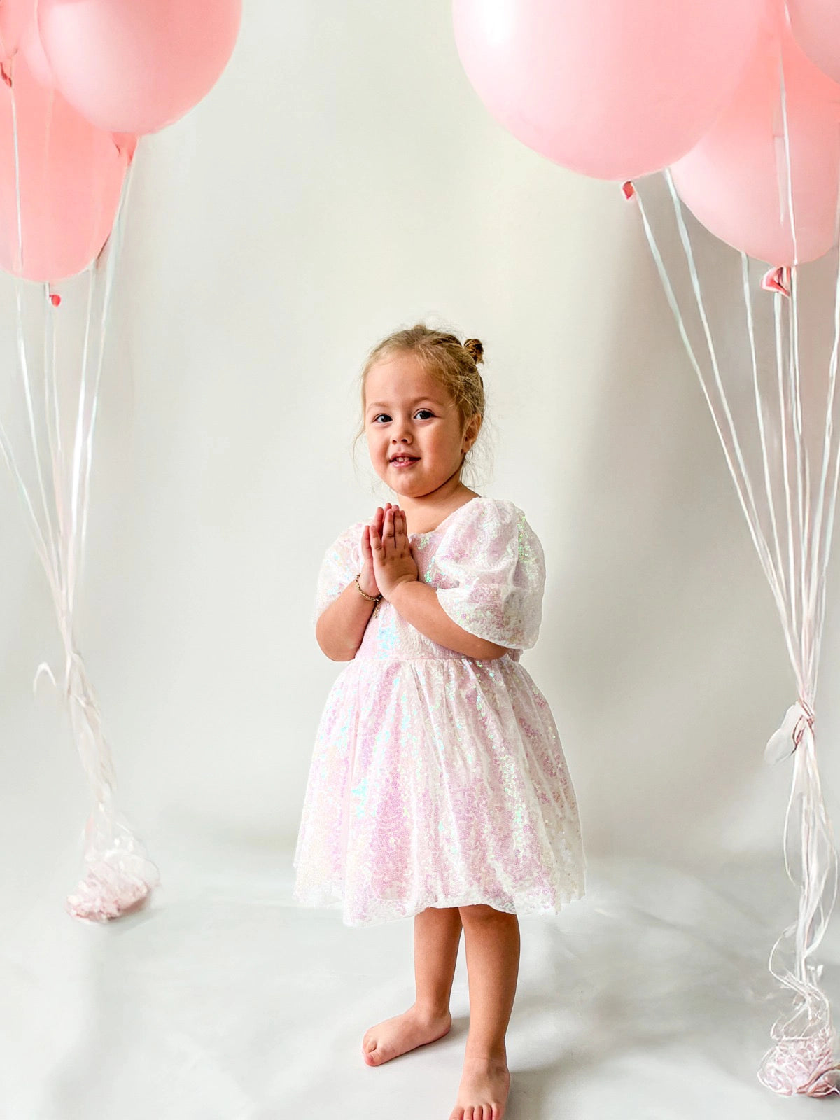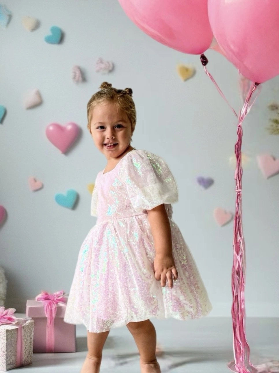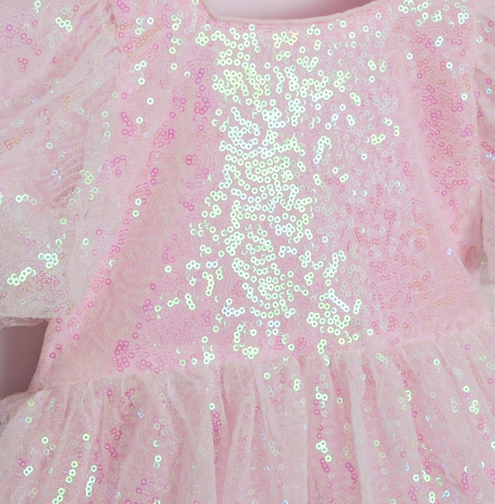 🩰 Glitter Dream – Sparkling Pink Girls' Dress The dance of sparkle and elegance comes to life in this stunning dress! With color-shifting sequins that catch the light and a stylish lace-up back detail, this piece is every little princess’s dream come true.