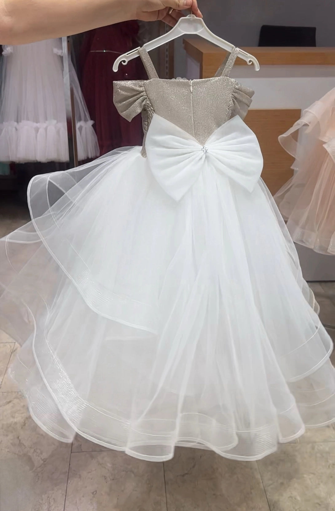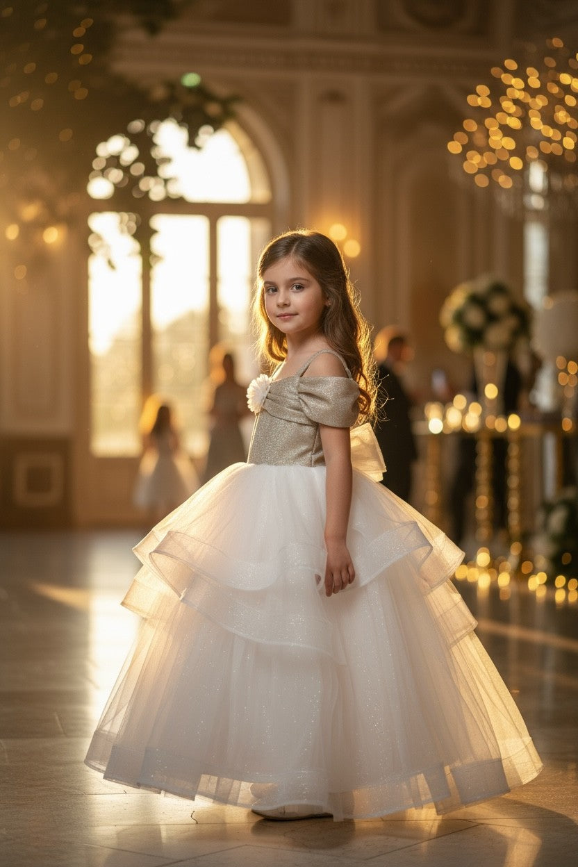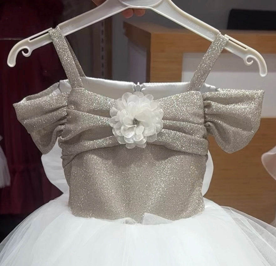 A mesmerizing design that brings together elegance and glamour for my little princesses! With its sparkling silver bodice, voluminous long layered tulle skirt, and delicate floral detail, this stunning dress is the perfect choice for special occasions!