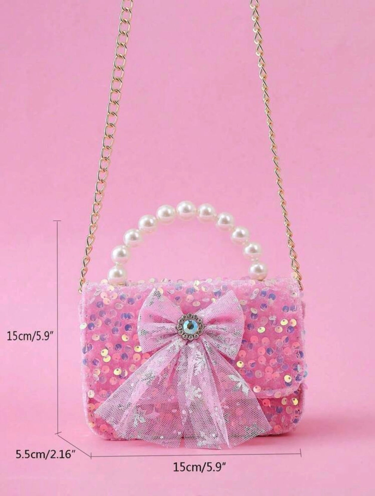 Glittery sequin fabric Pearl top handle gold chain strap Tulle bow with gem embellishment Functional size perfect for small treasures Can be carried by hand or worn as a crossbody With the Princess Sparkle Bag, every step shines and every moment feels like a fairytale🎀