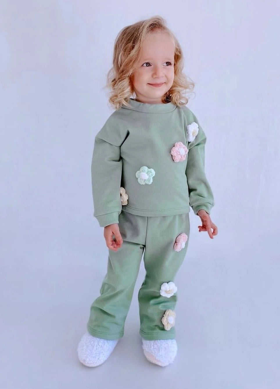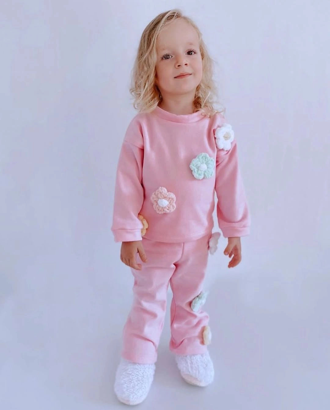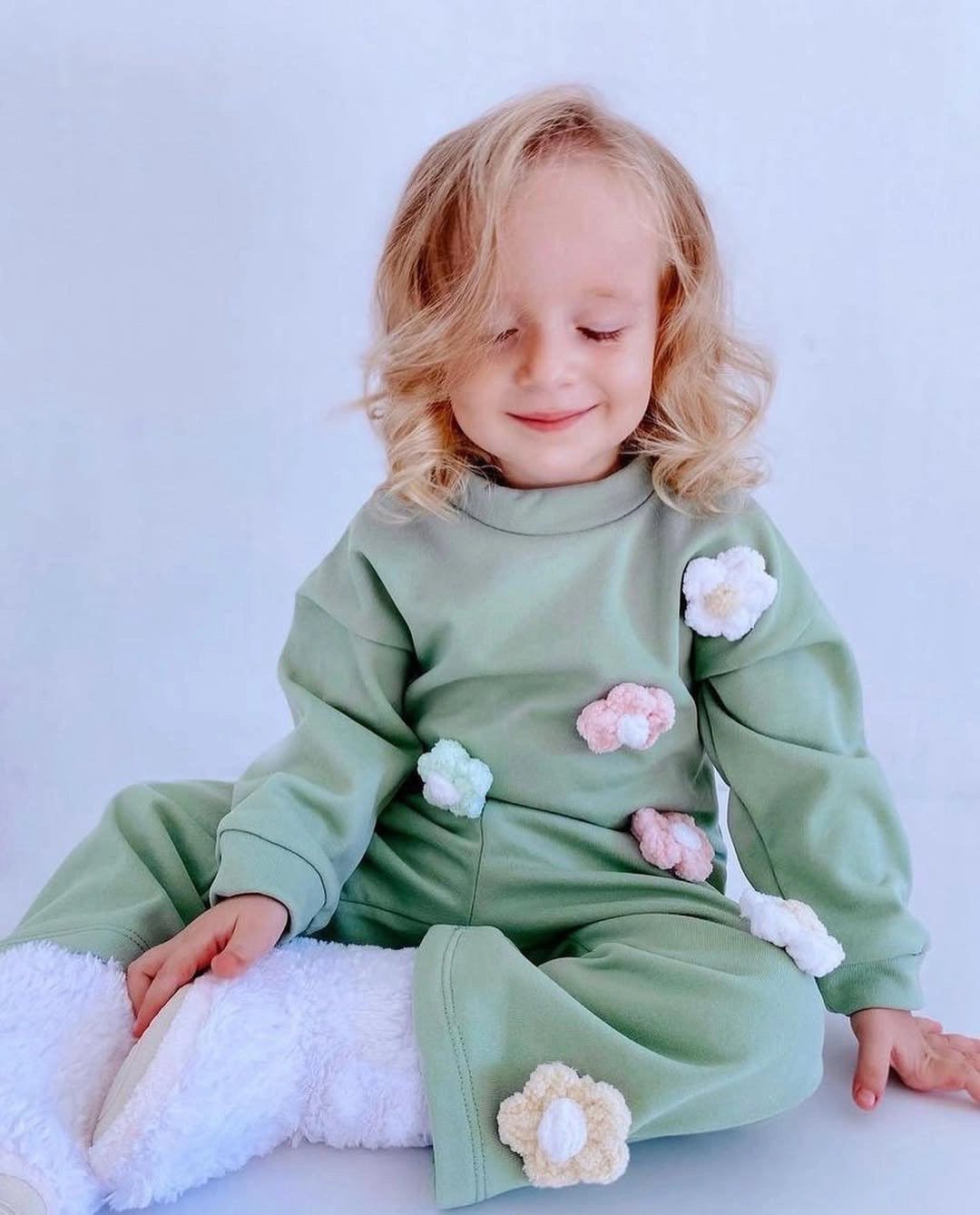 🌼 Designed for little princesses, this set is made from soft, two-thread jersey fabric that is both comfy and absolutely adorable! It’s crafted from 100% cotton. The colorful crochet flowers add a magical touch to the outfit. Each flower is handcrafted with crochet and delicately embroidered by hand. Available in pink and green color options to suit every taste. Made in Turkey. With its relaxed fit, your little one can move freely, whether playing or going about her daily activities. This set ensures your girl stays both comfortable and stylish at all times. 🌸