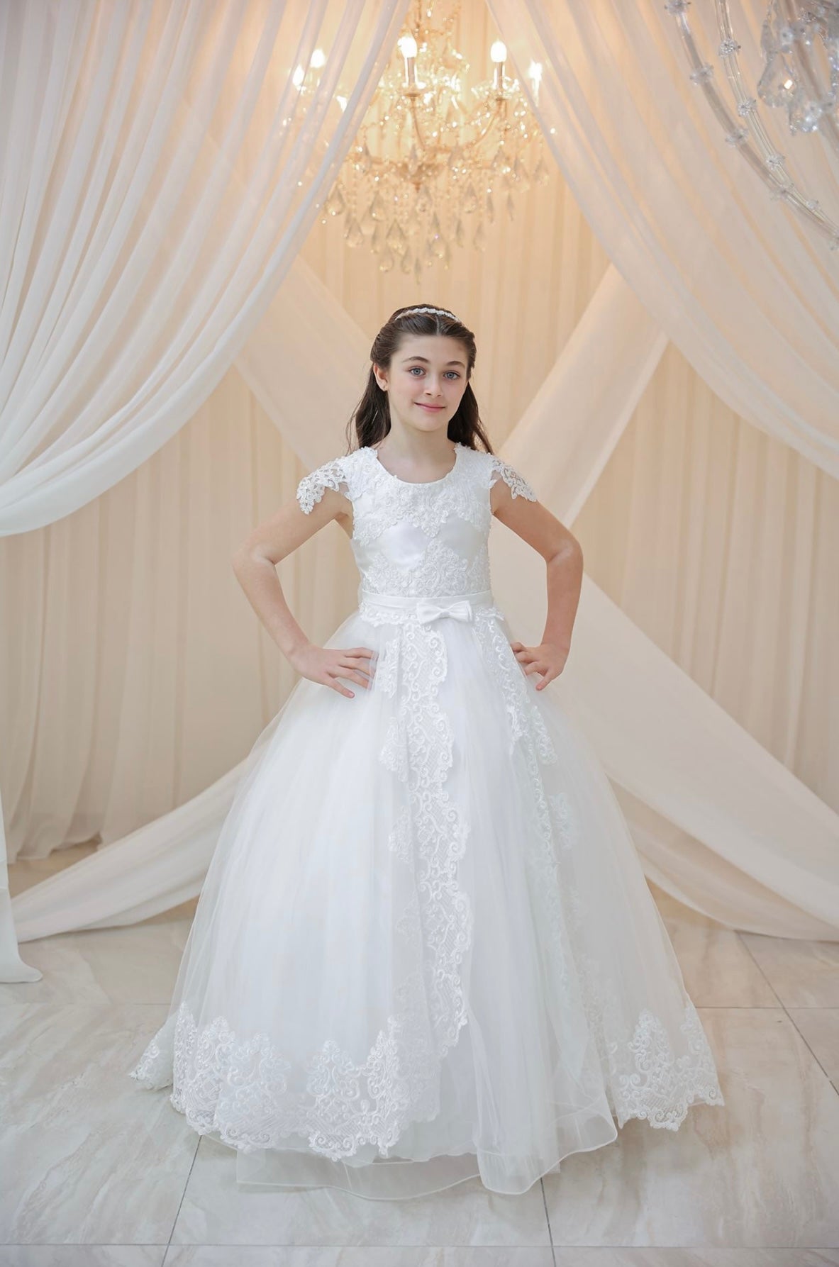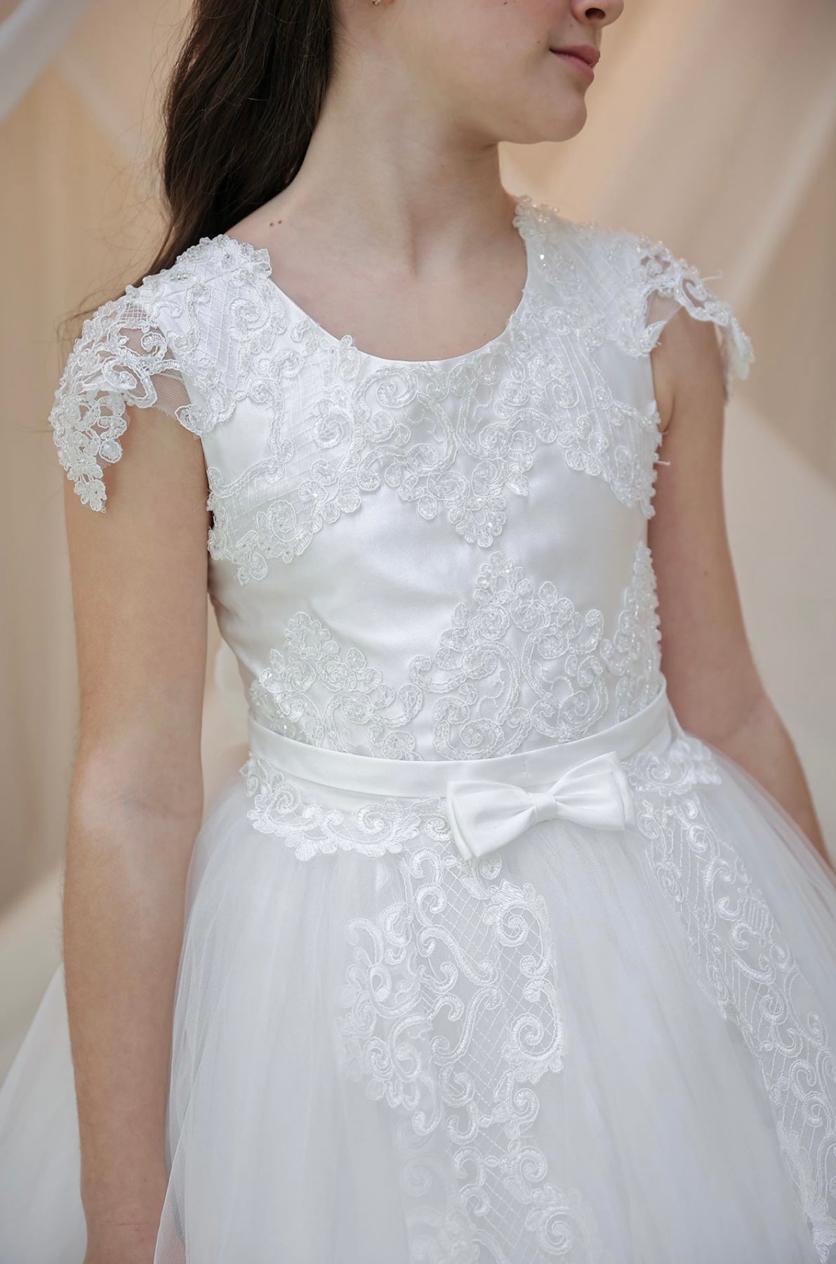 LACE DETAILED TULLE DRESS WITH BOW ACCESSORY AT THE WAIST FOR WEDDINGS COMMUNION AND SPECIAL OCCASIONS