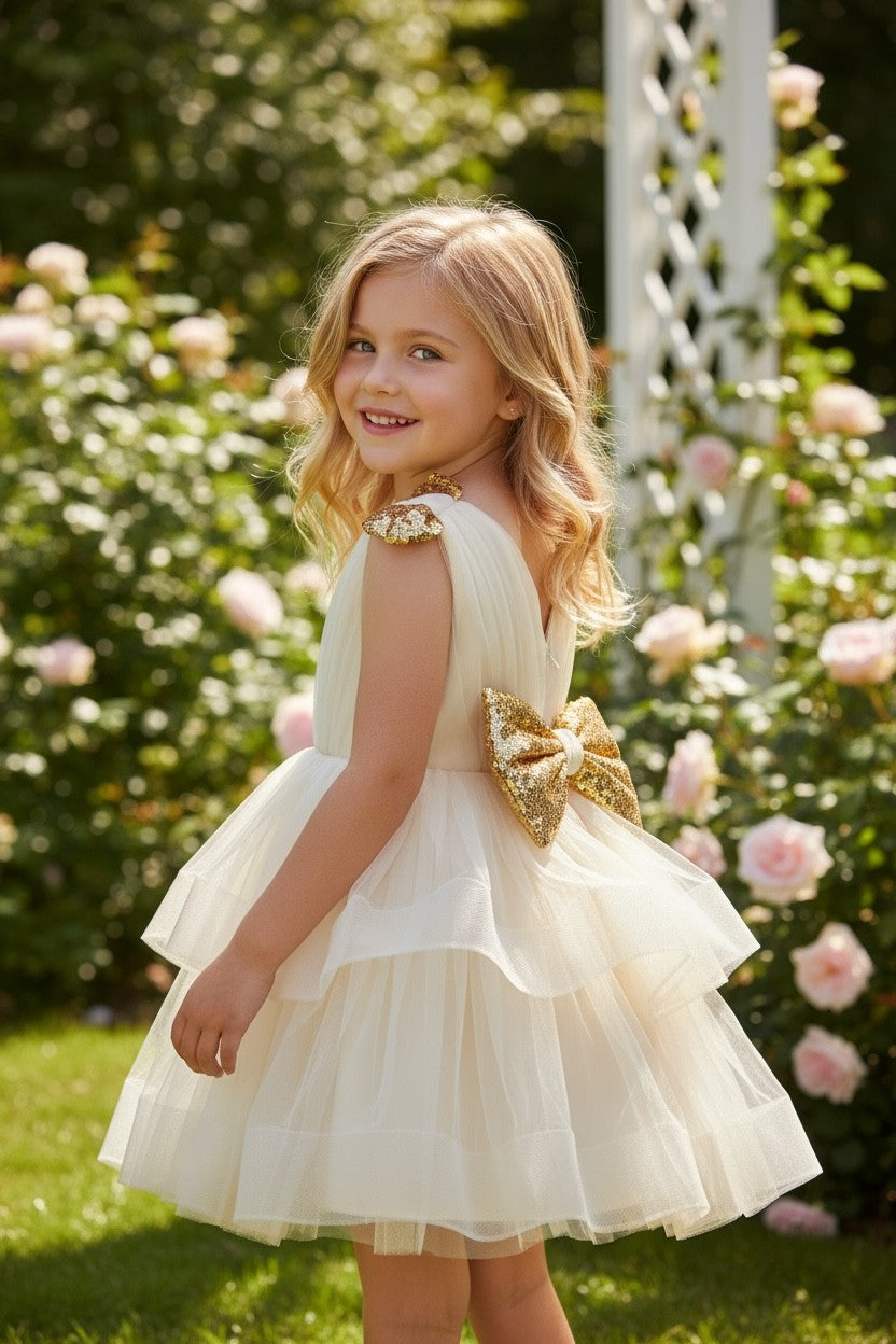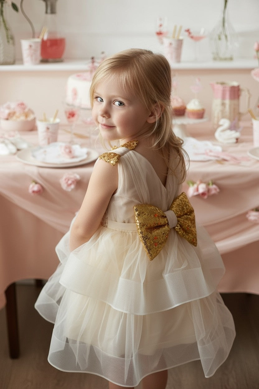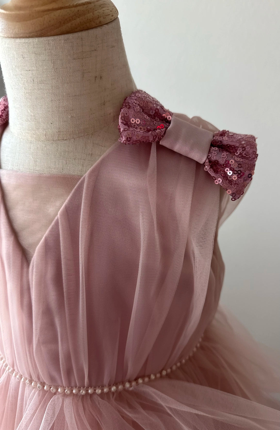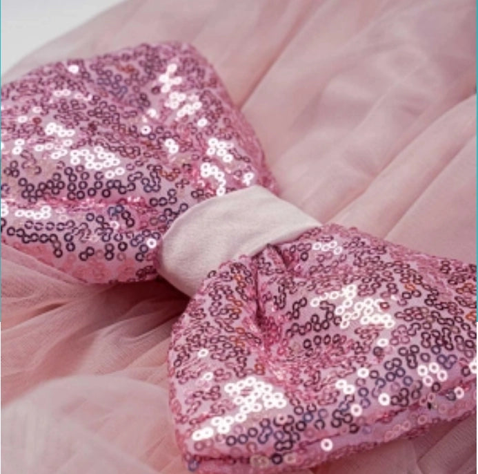 Designed for little princesses, this enchanting dress combines elegance and glamour. Featuring layered tulle, dazzling sequin embellishments on the shoulders, and a statement bow at the back, this dress is truly mesmerizing.