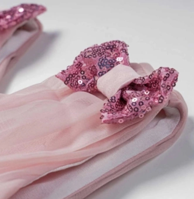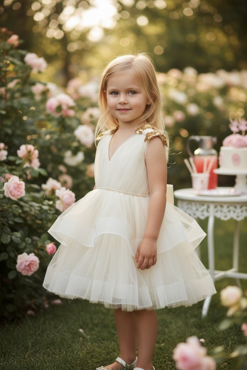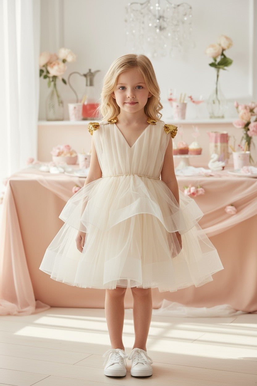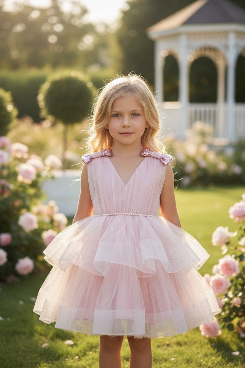 Designed for little princesses, this enchanting dress combines elegance and glamour. Featuring layered tulle, dazzling sequin embellishments on the shoulders, and a statement bow at the back, this dress is truly mesmerizing.