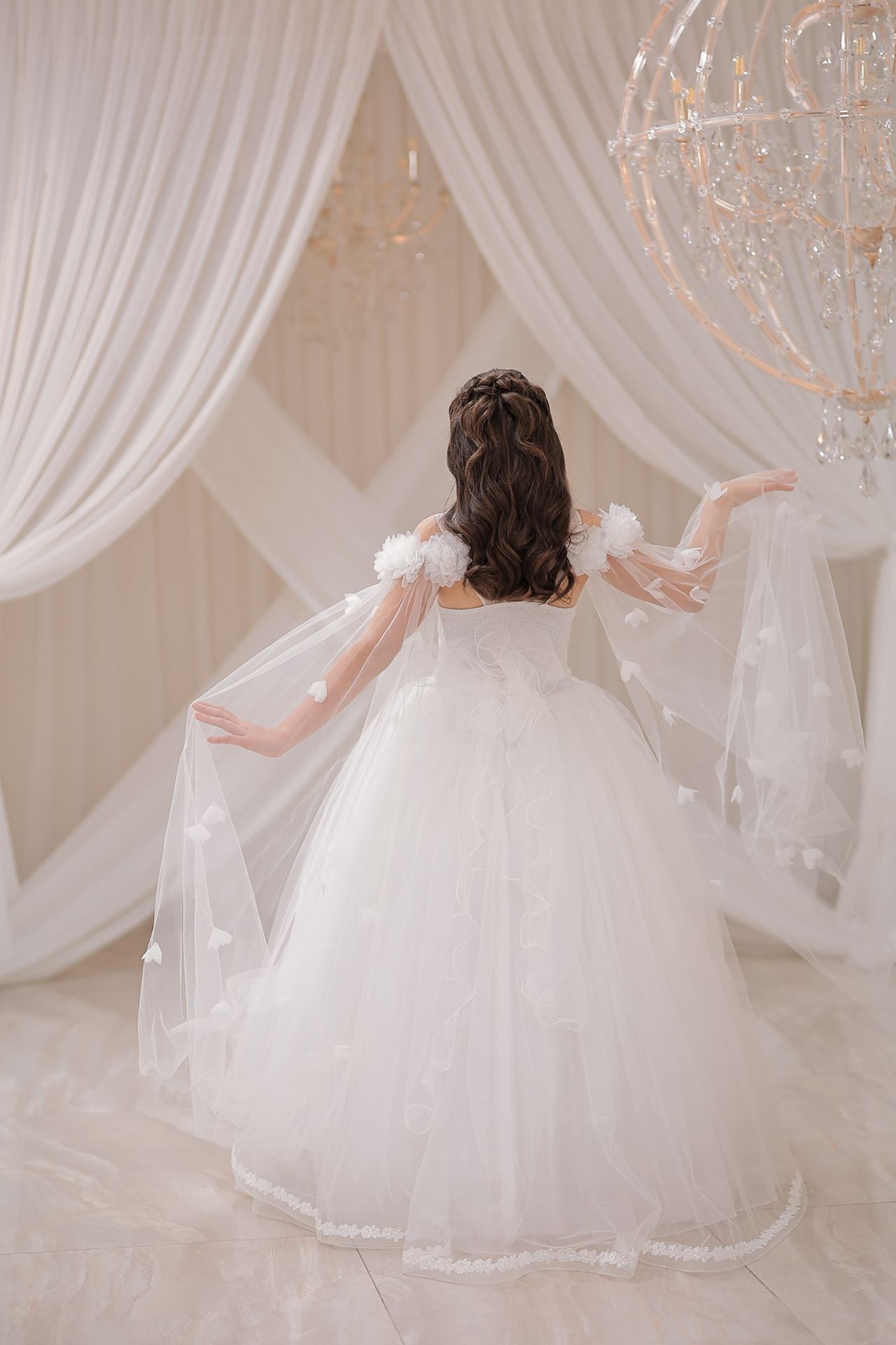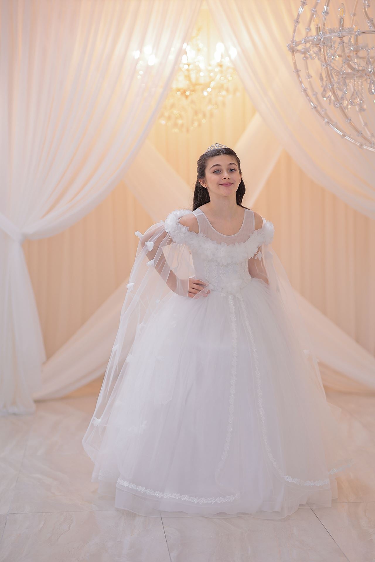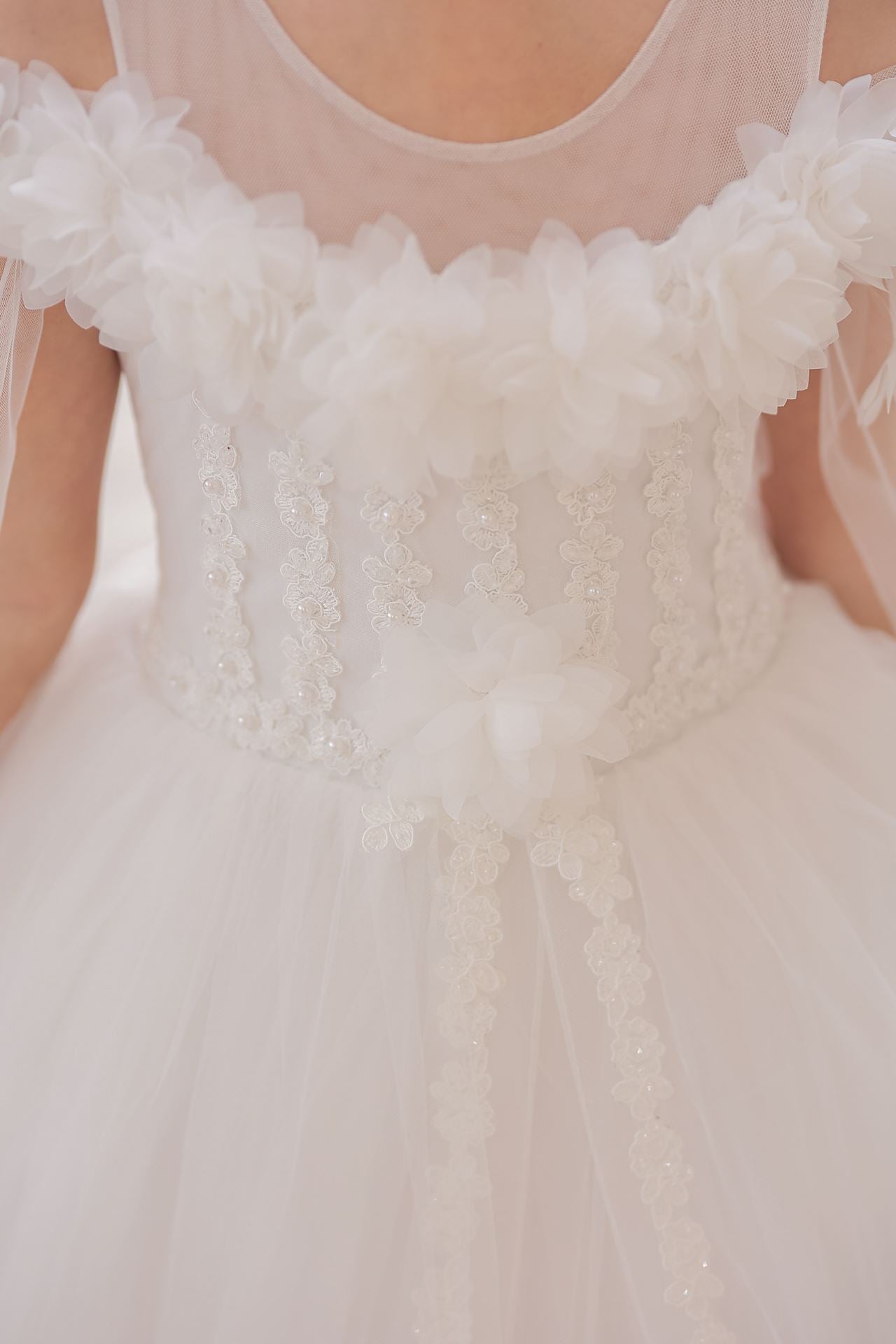 Dress brings together the purest form of off-white with the gentle dream of princess skirts. The elegant line of the round neckline is in perfect harmony with the gentle touch of the princess sleeve. The light and impressive structure of tulle fabric (100% polyester) gently hugs little princesses with every movement. This dress, expertly produced in Turkey, is enriched with appliques, beading, 3D flowers details, layered skirts and hem details, and decorated with ribbon applications. This wonderful dress will be the favorite of little princesses in every environment, from weddings to religious ceremonies, cultural events and special holidays, and will be the symbol of elegance and innocence at every step.