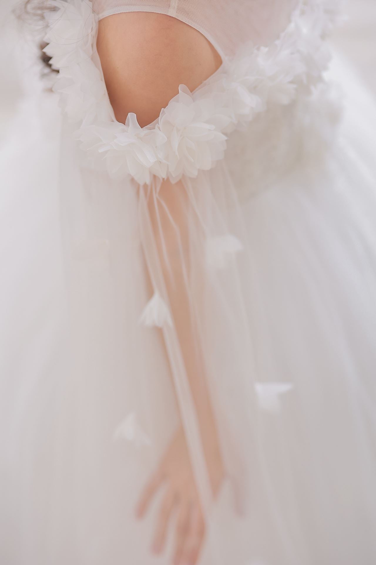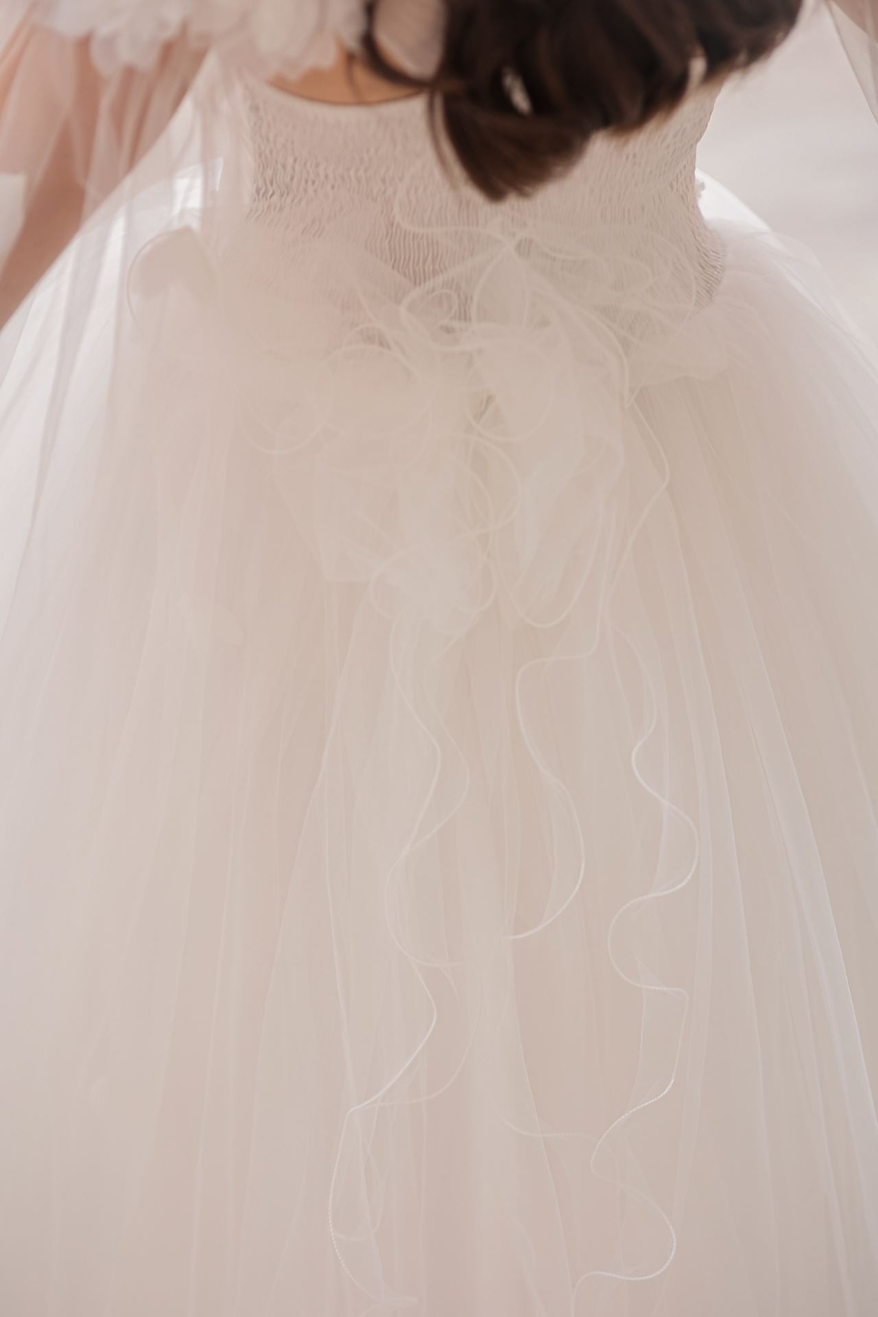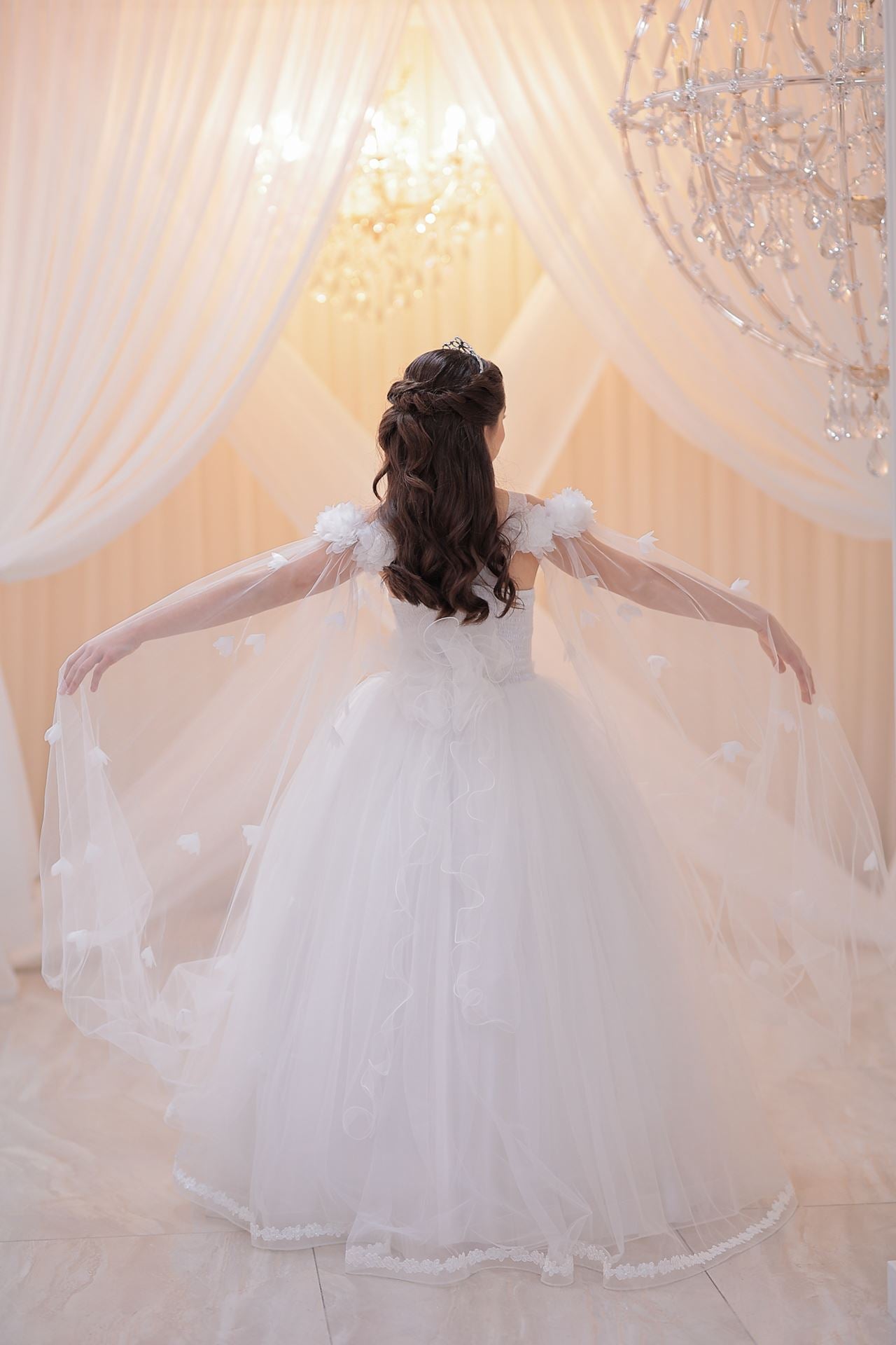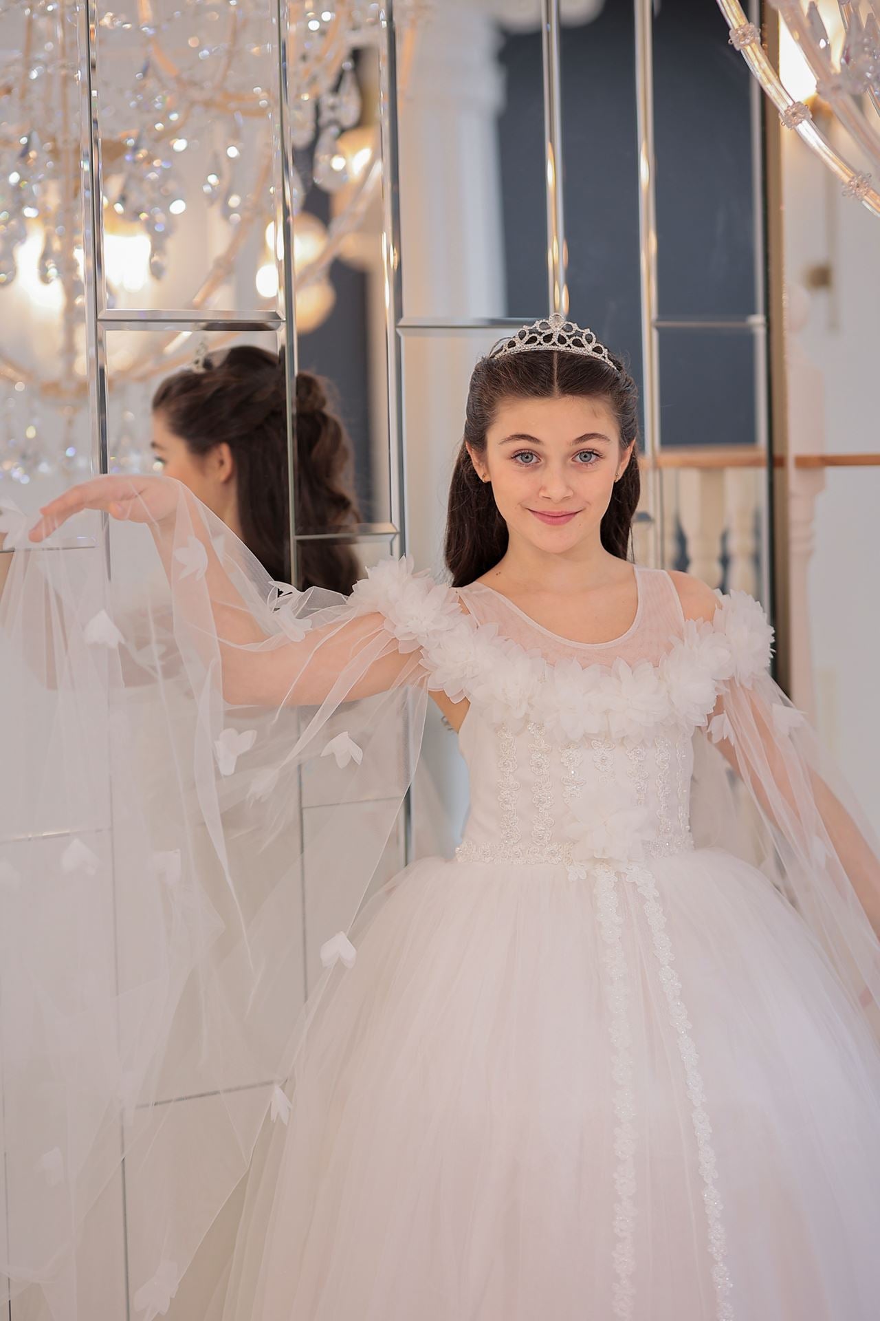 Dress brings together the purest form of off-white with the gentle dream of princess skirts. The elegant line of the round neckline is in perfect harmony with the gentle touch of the princess sleeve. The light and impressive structure of tulle fabric (100% polyester) gently hugs little princesses with every movement. This dress, expertly produced in Turkey, is enriched with appliques, beading, 3D flowers details, layered skirts and hem details, and decorated with ribbon applications. This wonderful dress will be the favorite of little princesses in every environment, from weddings to religious ceremonies, cultural events and special holidays, and will be the symbol of elegance and innocence at every step.