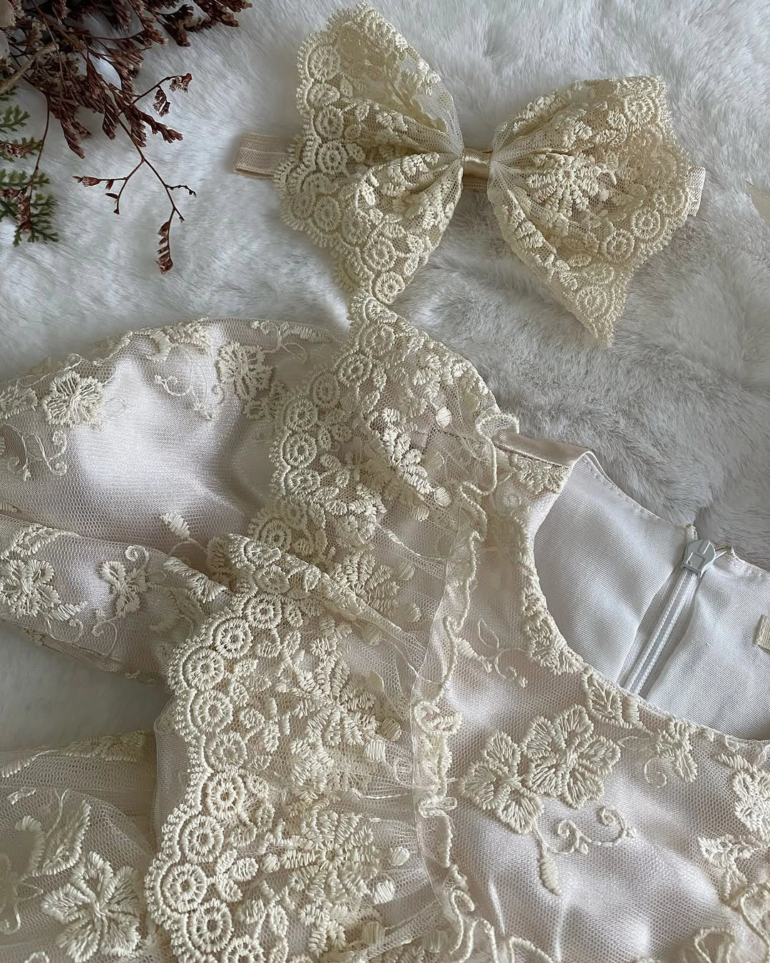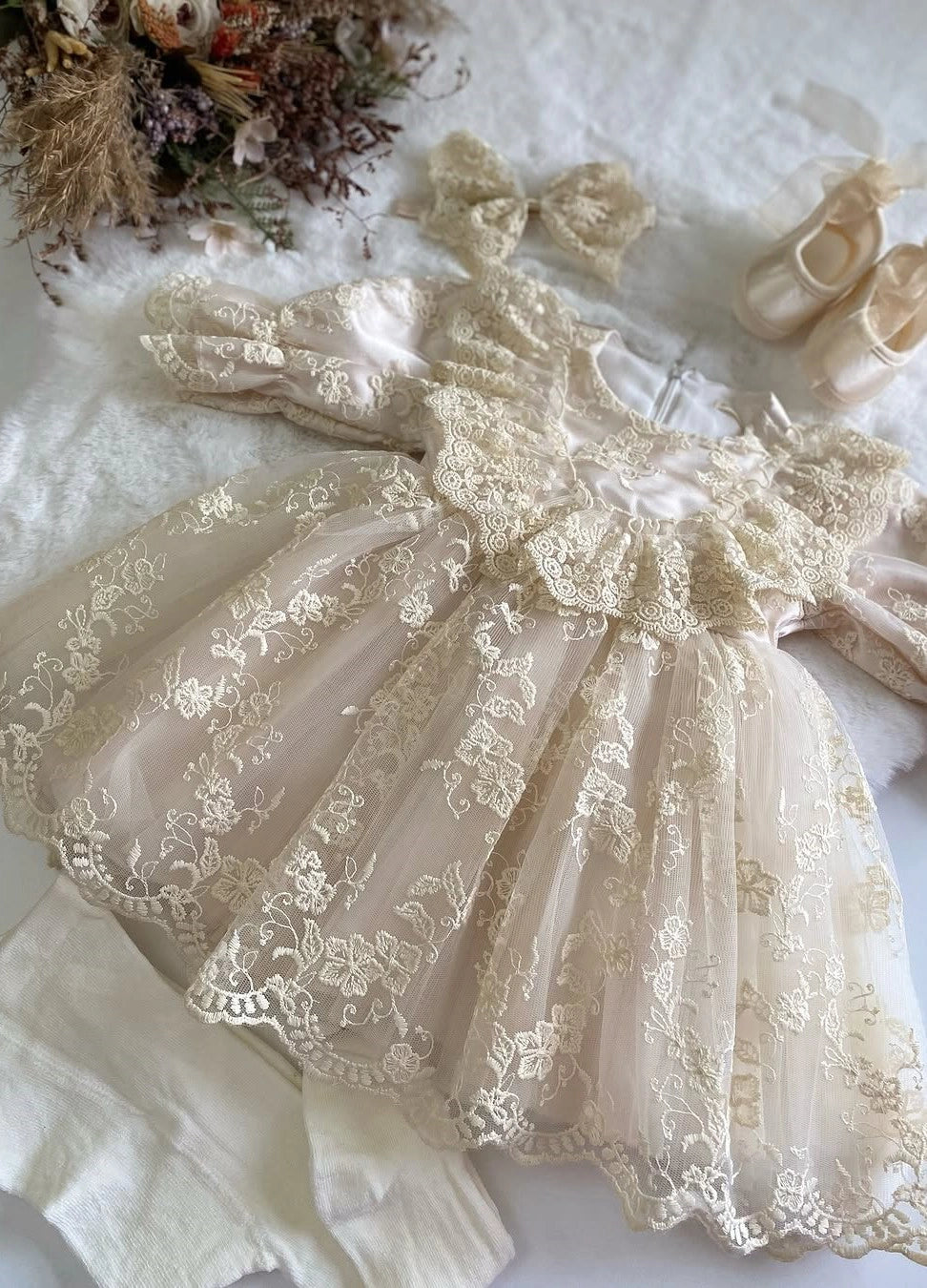 💖 Eye-catching ruffle details and embroidered lace fabric, Elegance completed with specially designed hair accessories, Perfect harmony with delicate ribbon-detailed mini booties