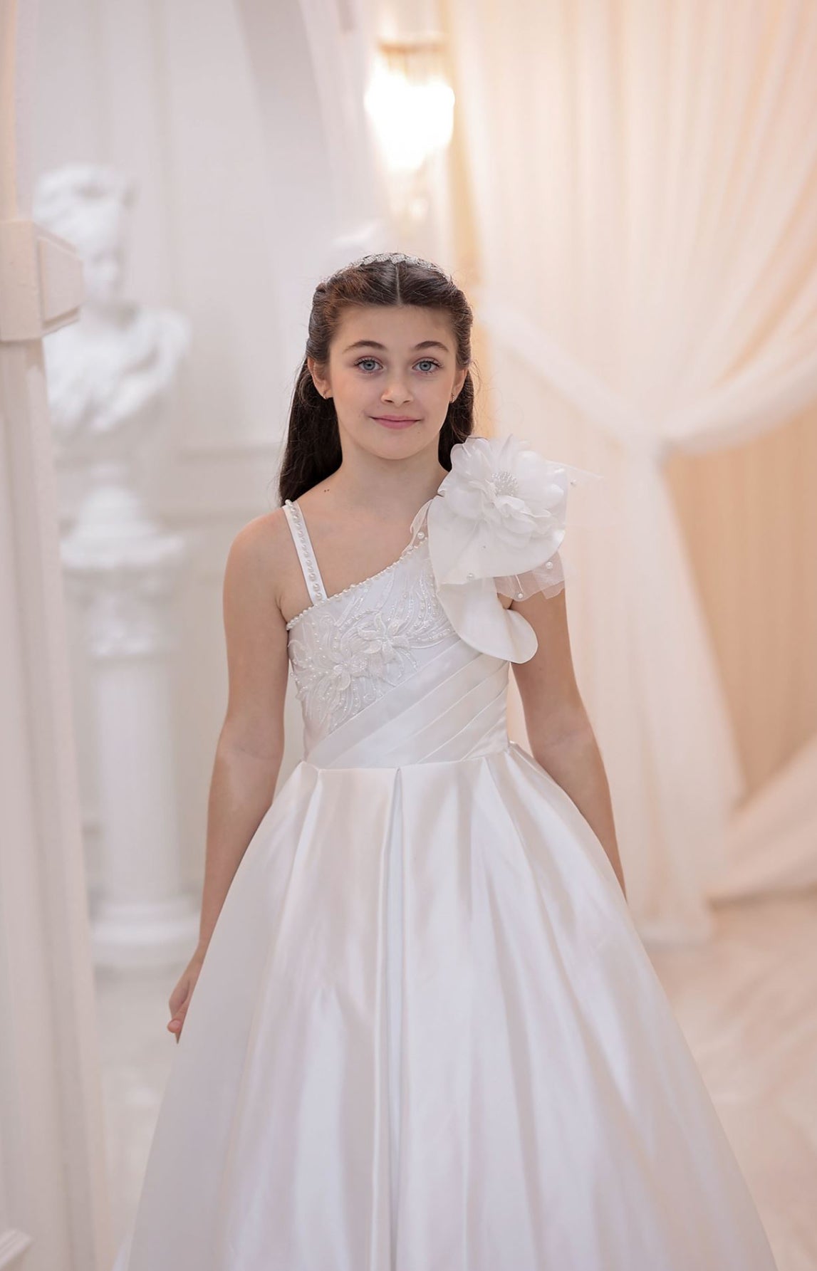 Every little princess’s dream comes true with this special design, featuring elegant pearl straps, an asymmetric floral detail, and a shiny satin skirt that creates a stunning look. 👑✨