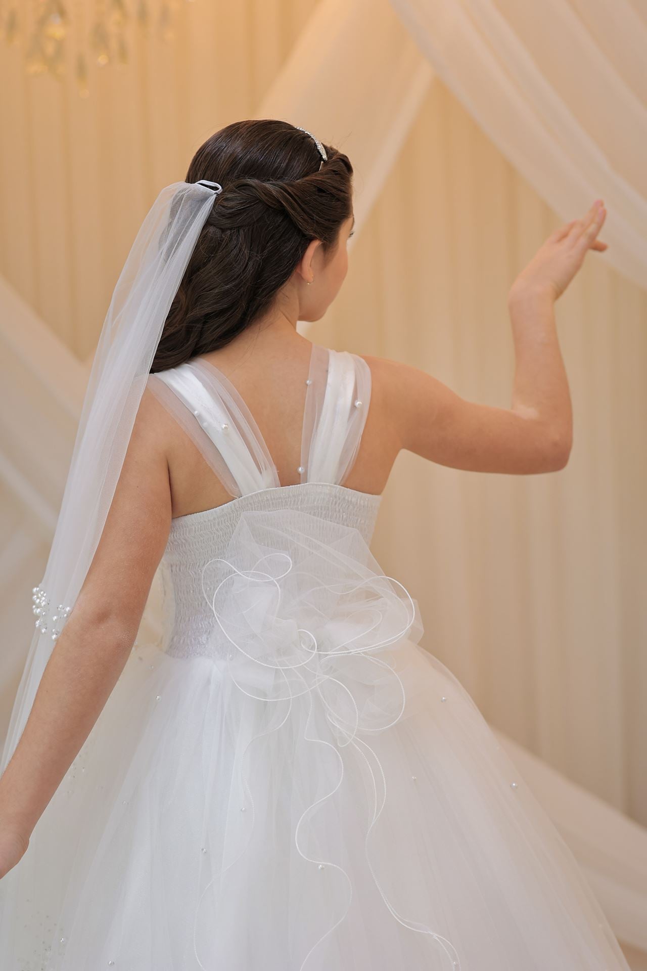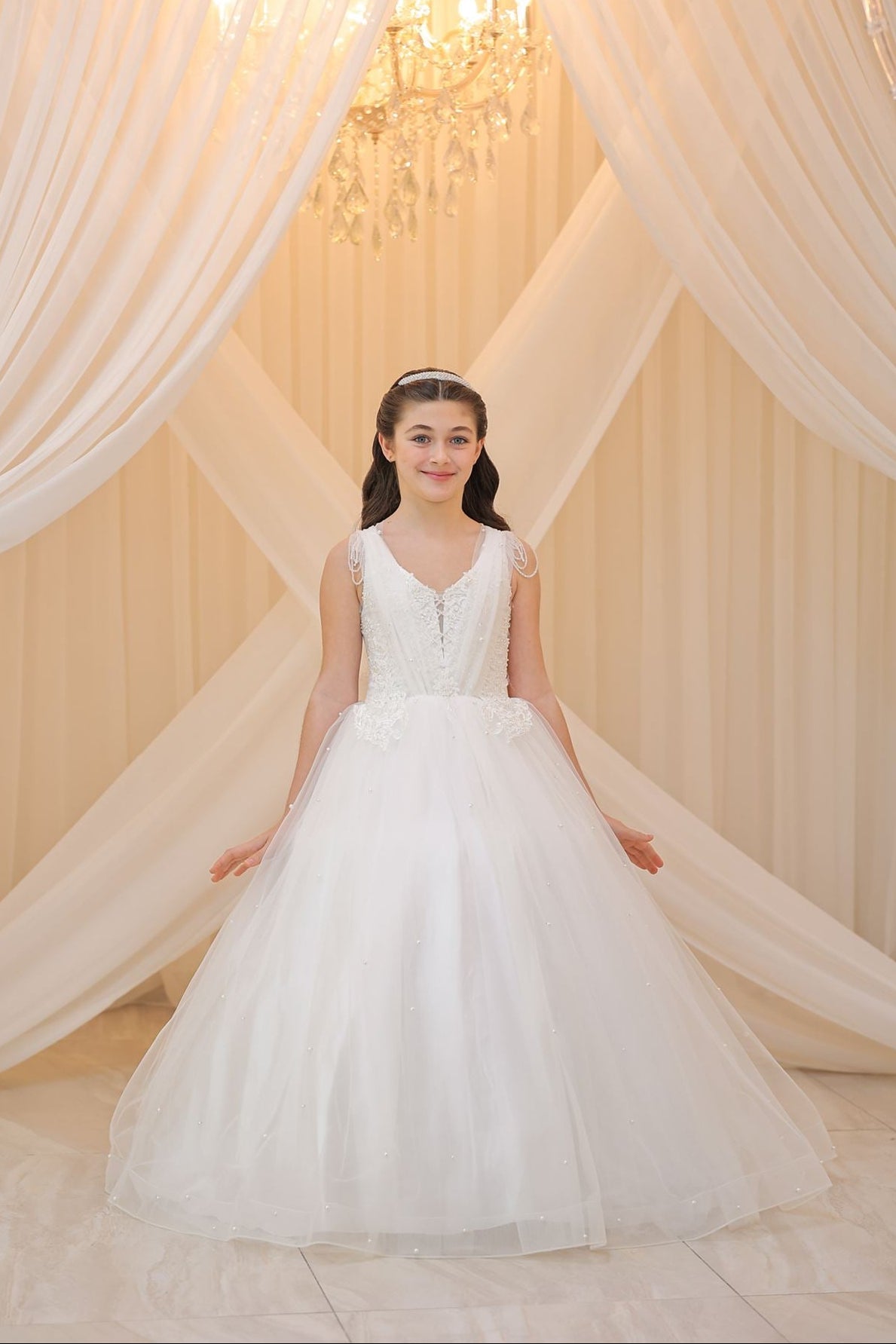 Dress expresses the magic of off-white with its sweetheart neckline and light texture of tulle. While the sleeveless design simply embraces the elegance of young princesses, it is in perfect harmony with the gentle and impressive structure of the 100% polyester tulle fabric. Expertly produced in Turkey, this dress offers an elegant look at any special event, enhanced with appliques, beading, shoulder details and pearl and stone embroidery. Stripe applications and full rubber closure provide both elegant and practical use. Calais will be the favorite of young princesses in every occasion, from weddings to religious ceremonies, cultural events and special holidays, offering the charming combination of elegance and innocence at every step.