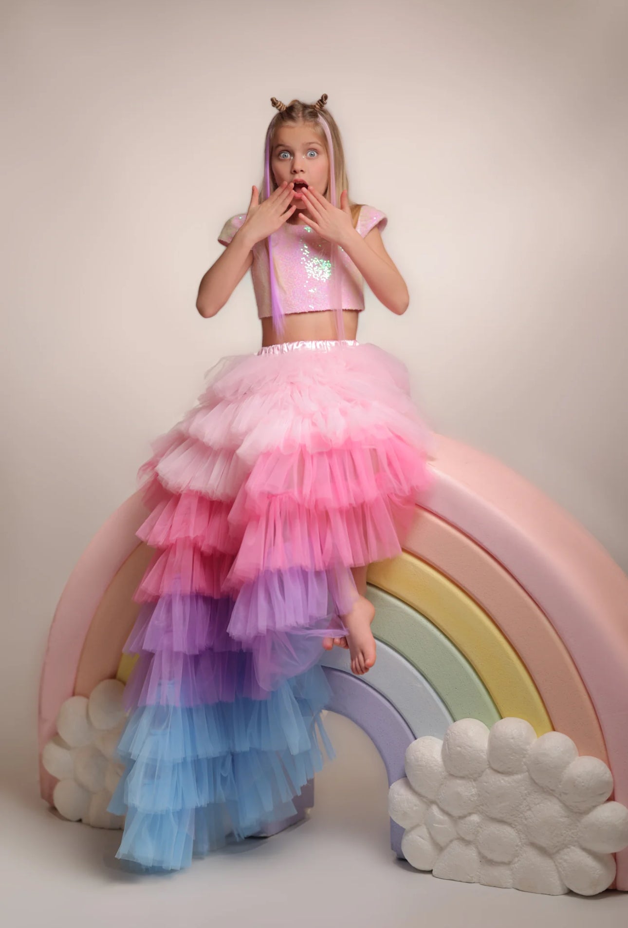 This stunning Rainbow Magic Two-Piece Set is designed to make every birthday, celebration, and photoshoot unforgettable. Featuring a shimmering sequin top and a voluminous layered tulle skirt, it combines elegance, comfort, and sparkle in one dreamy outfit. π