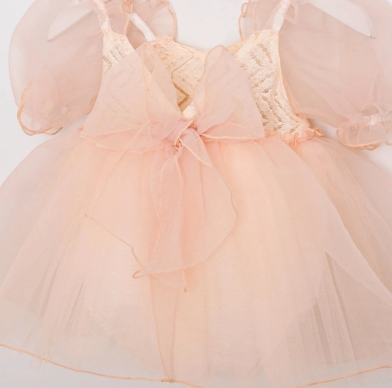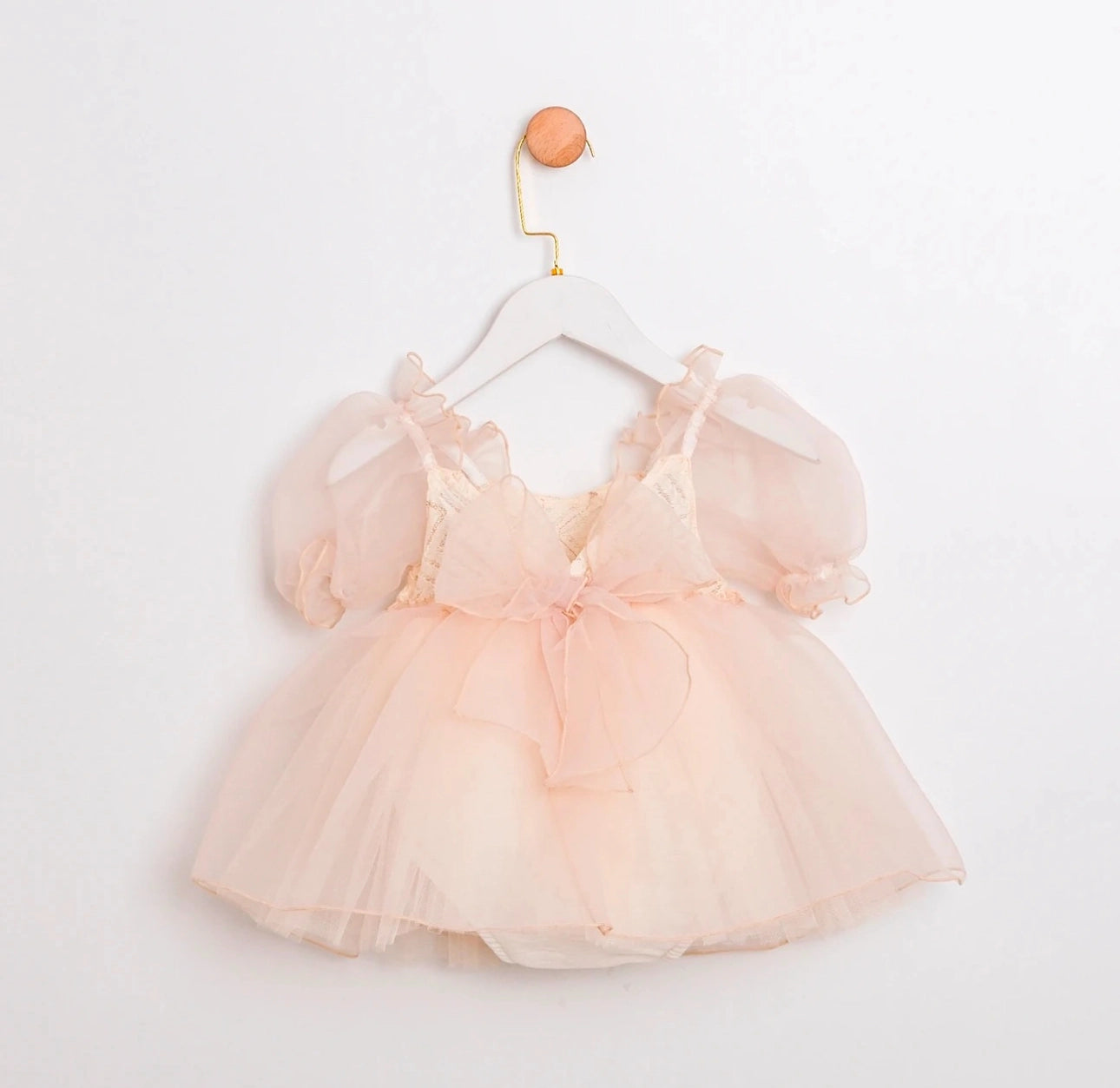 This elegant romper dress adds a romantic fairytale touch to your little princess’s very first steps. The nostalgic beige lace look on the bodice gives the dress a vintage elegance, while the soft tulle skirt, fluttery sleeve details, and charming bow at the back complete the dreamy design. Every detail offers a combination of comfort and eye-catching beauty.