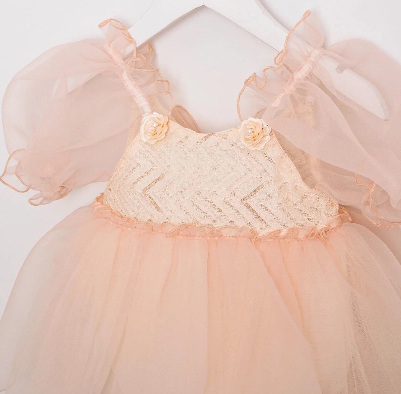 ROSE DETAILED PUFF SLEEVE LACE AND TULLE BEIGE DRESS PERFECT FOR BIRTHDAYS WEDDINGS AND CHRISTENINGS