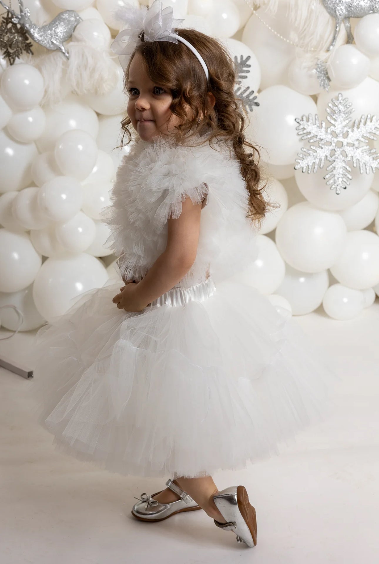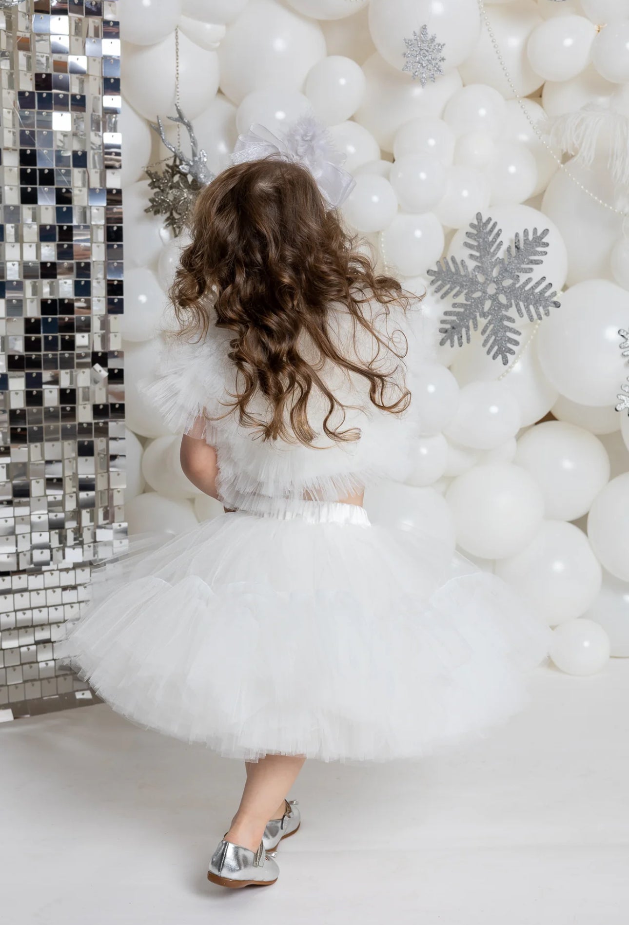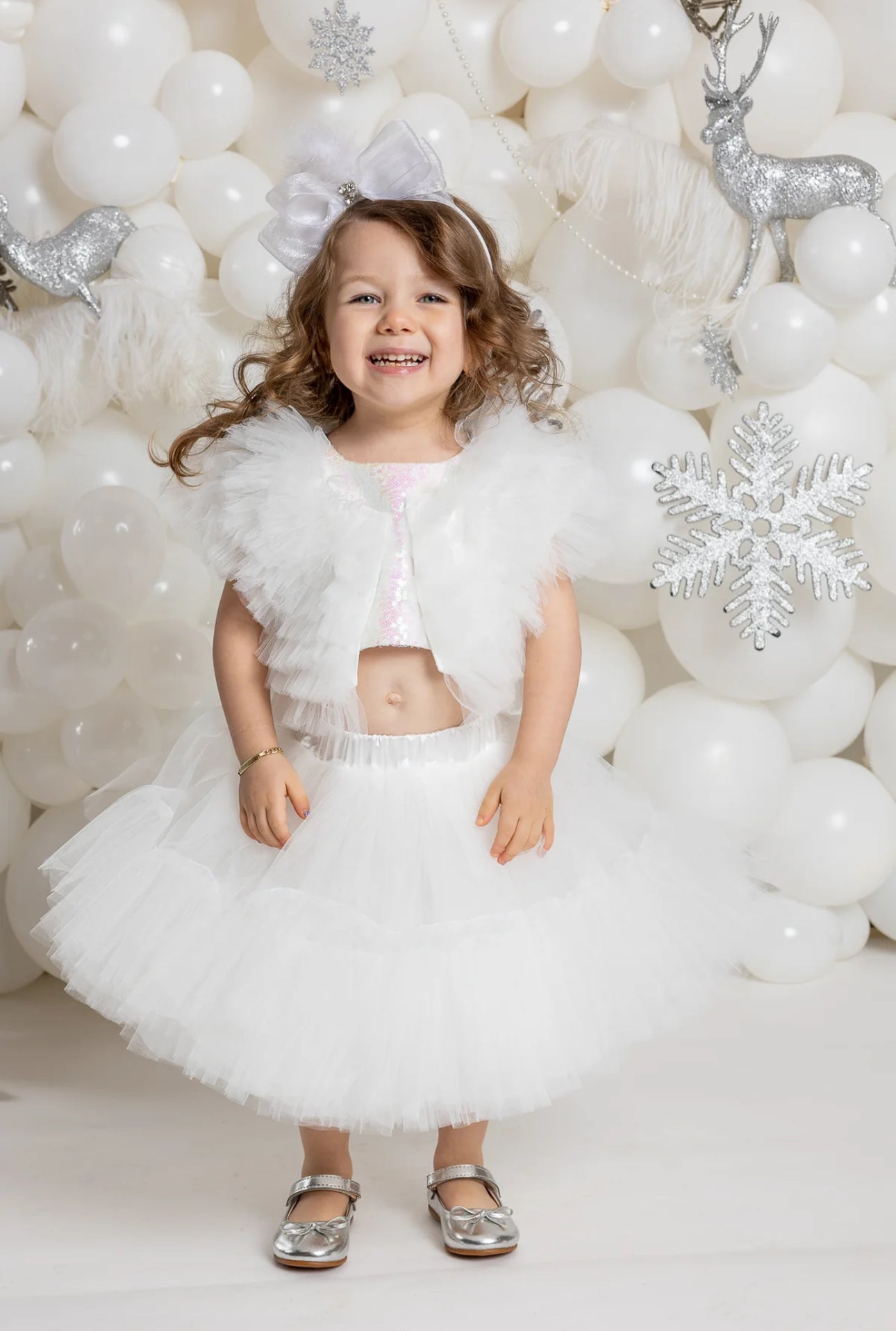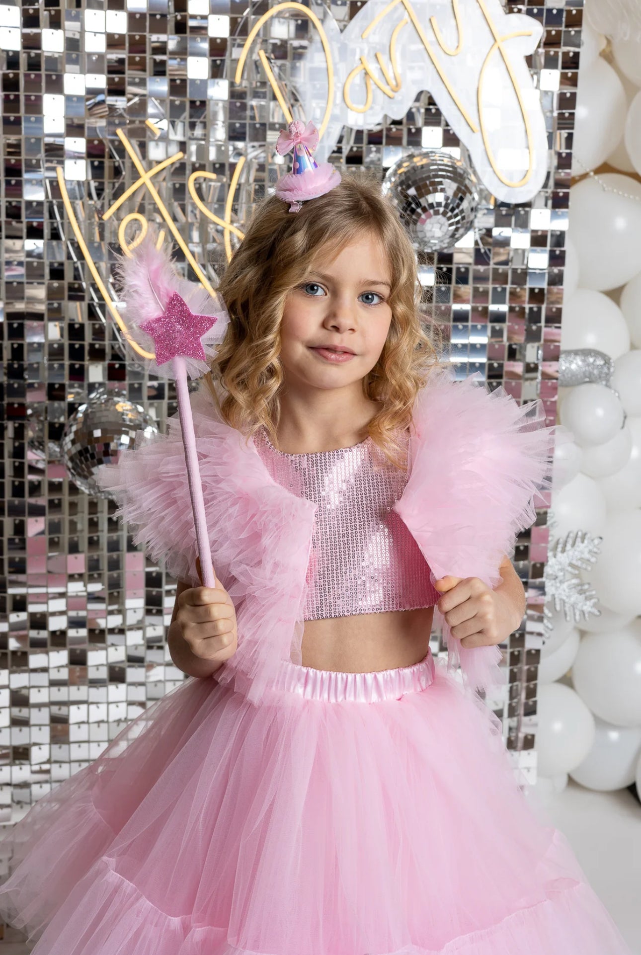 The set includes a sequin crop top, a layered tulle skirt, and a ruffled tulle bolero the perfect choice for birthdays, parties, and all special celebrations. 💖