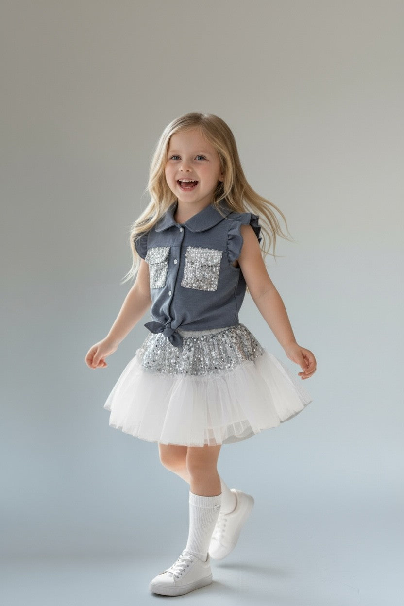 💖 Chic blouse with ruffled sleeves and sequin pocket details, Stunning silver sequin skirt with delicate white tulle details,