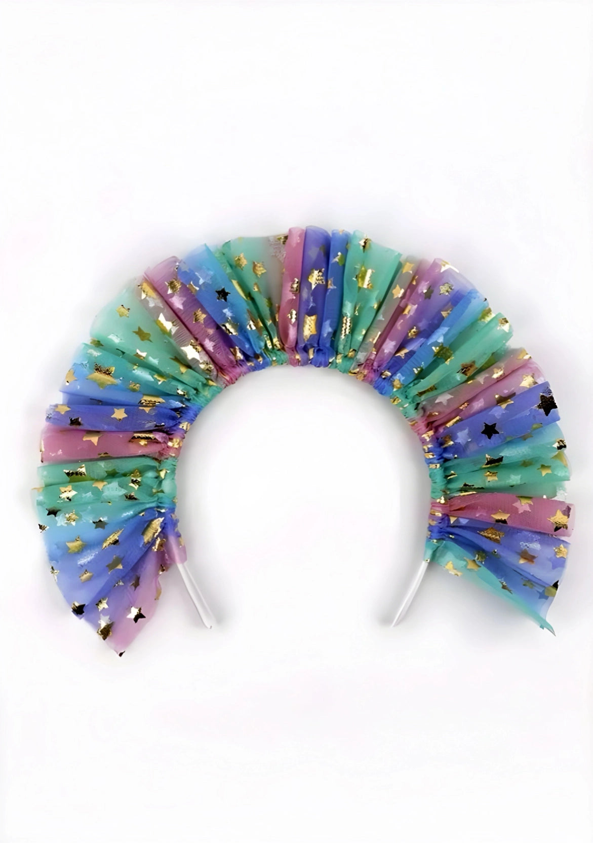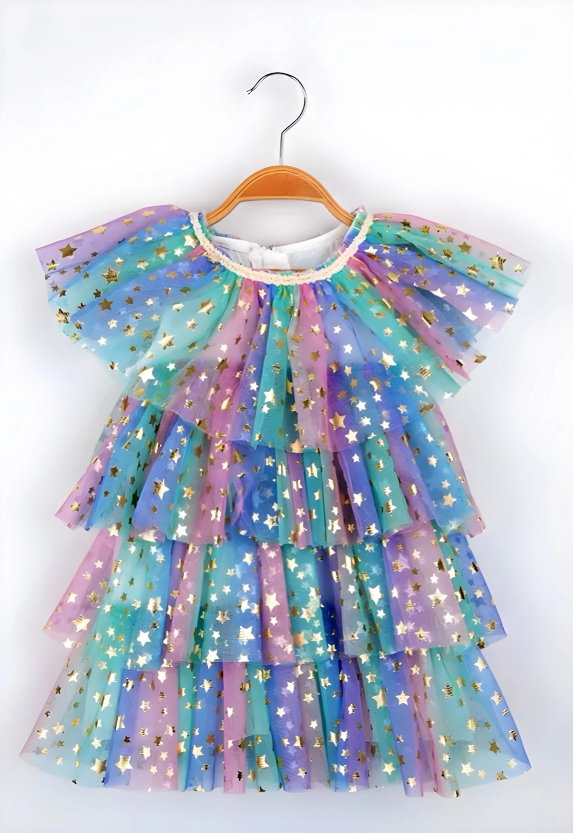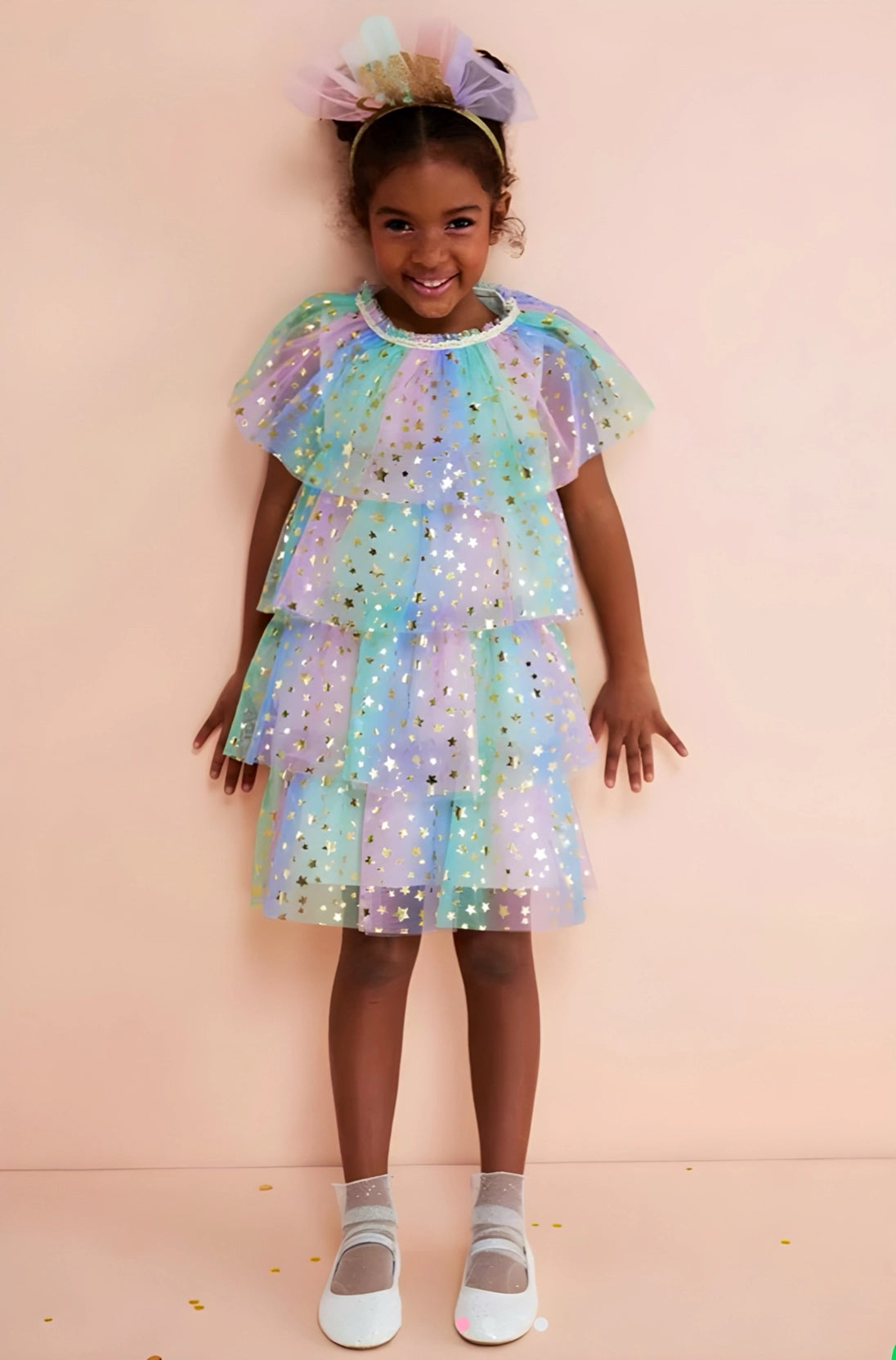 Shimmering Star-Patterned Colorful Tulle Dress (Hair Accessory Combination)