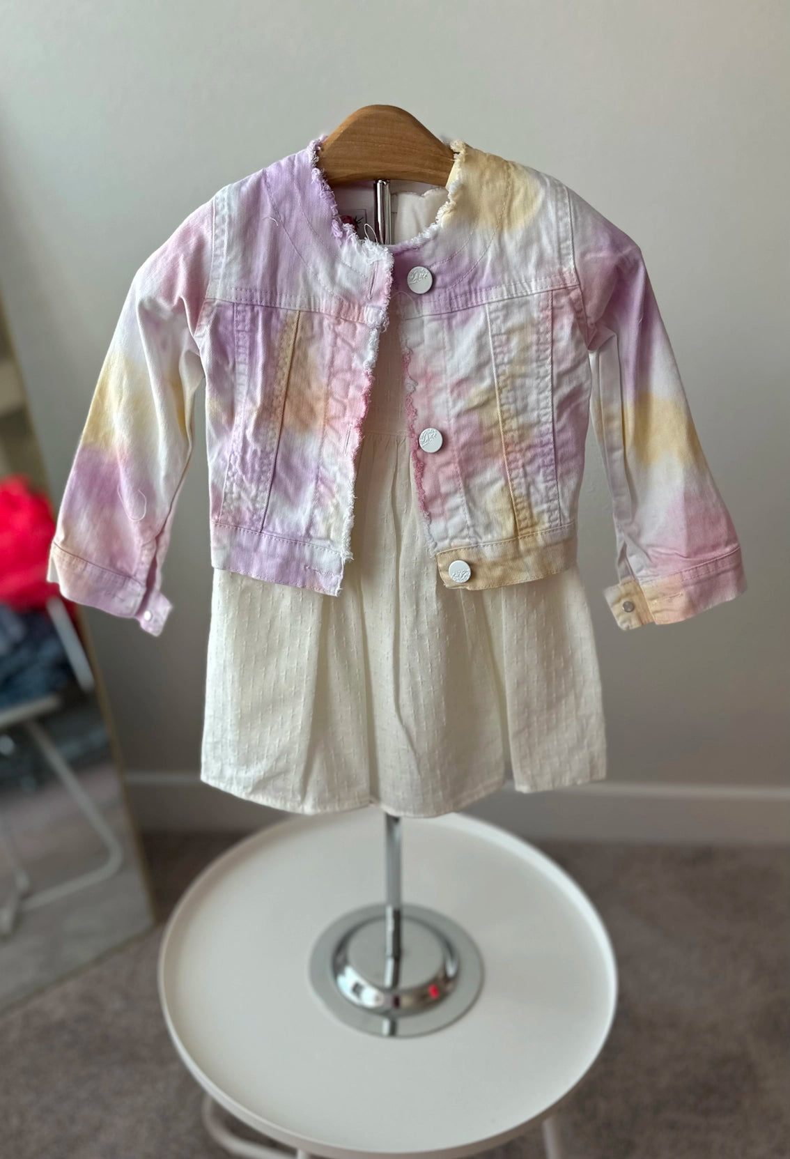 ✨ Pastel Elegance: Tie-Dye Denim Jacket and Cream Dress Set! ✨