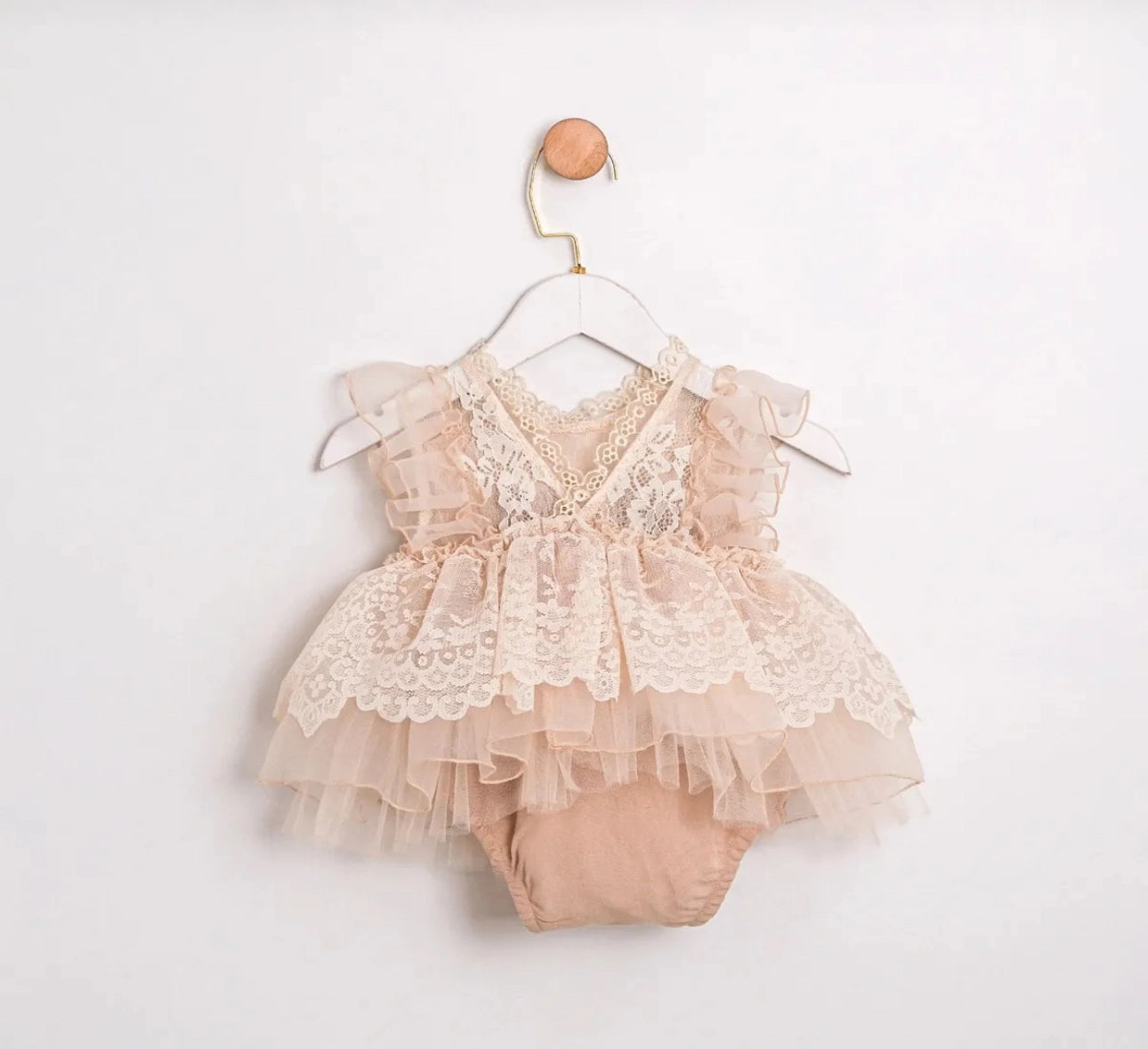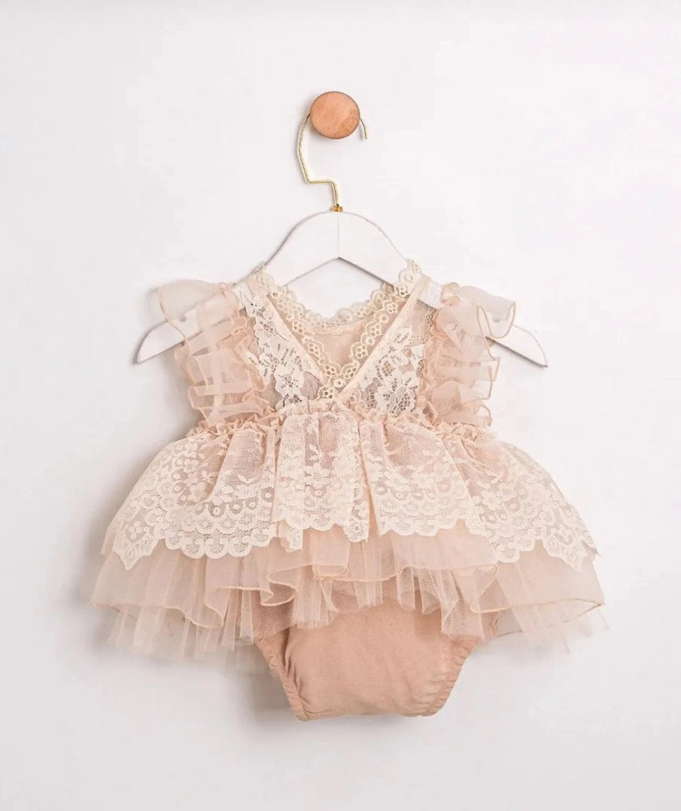 This adorable lace-detailed romper brings a touch of vintage charm to little hearts! With its layered tulle skirt gently swaying and the romantic feel of embroidered lace, combined with a soft inner romper, it offers a look that’s both eye-catching and comfortable.