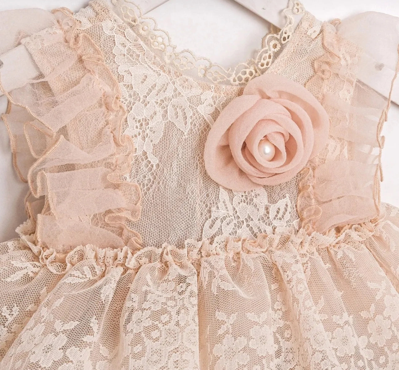 🌸 Frilly shoulder details – Playful, sweet, and fun! Elegant flower applique with pearl detail on the chest A delightful look completed with the matching tulle headband