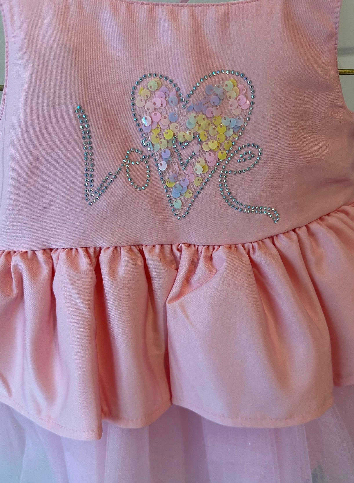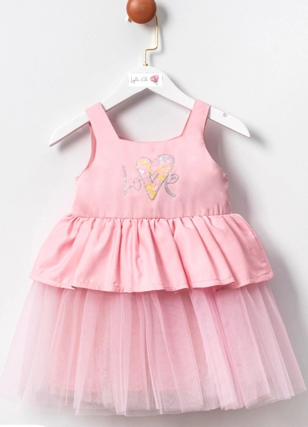 💖 Eye-catching design with a shimmering "Love" inscription and sequin heart detail, comfortable and lightweight fabric on the top, voluminous tulle skirt for a fairytale look, Lightweight structure ensuring all-day comfort, with a 100% cotton lining, A unique choice for special occasions, birthdays, parties, and photoshoots! Lovingly made in Turkey for our little princesses.