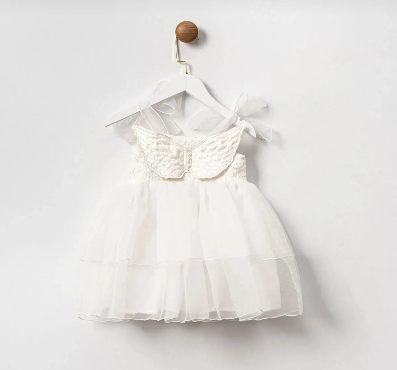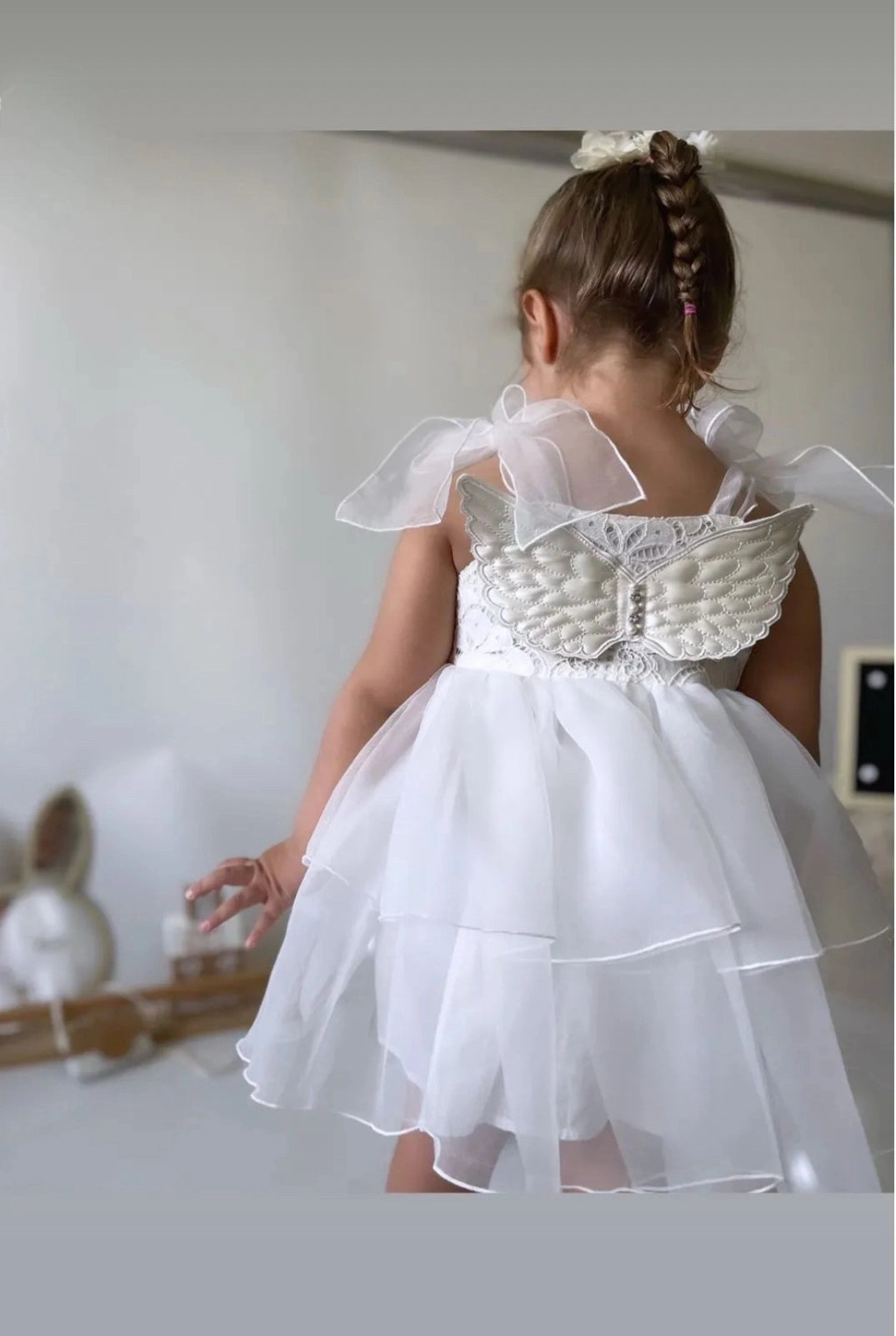 WHITE ANGEL WING PEARL BUTTON TIERED 3D TULLE LACE BIRTHDAY CHRISTENINGS AND WEDDINGS SPECIAL OCCASION ANGEL DRESS