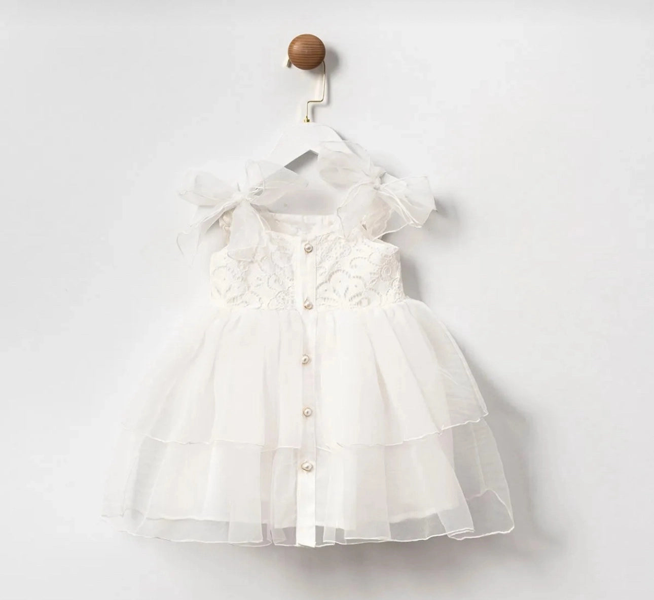 This elegant white dress, featuring a 3D angel wing detail on the back, resembles a little angel floating down from the sky. With its tiered tulle skirt and lace bodice, it offers a look that’s both romantic and modern. The oversized bow ties on the shoulders add a playful touch, while the delicate button accents complete the overall charm. Tiered tulle skirt for a flowy and voluminous silhouetteÂ