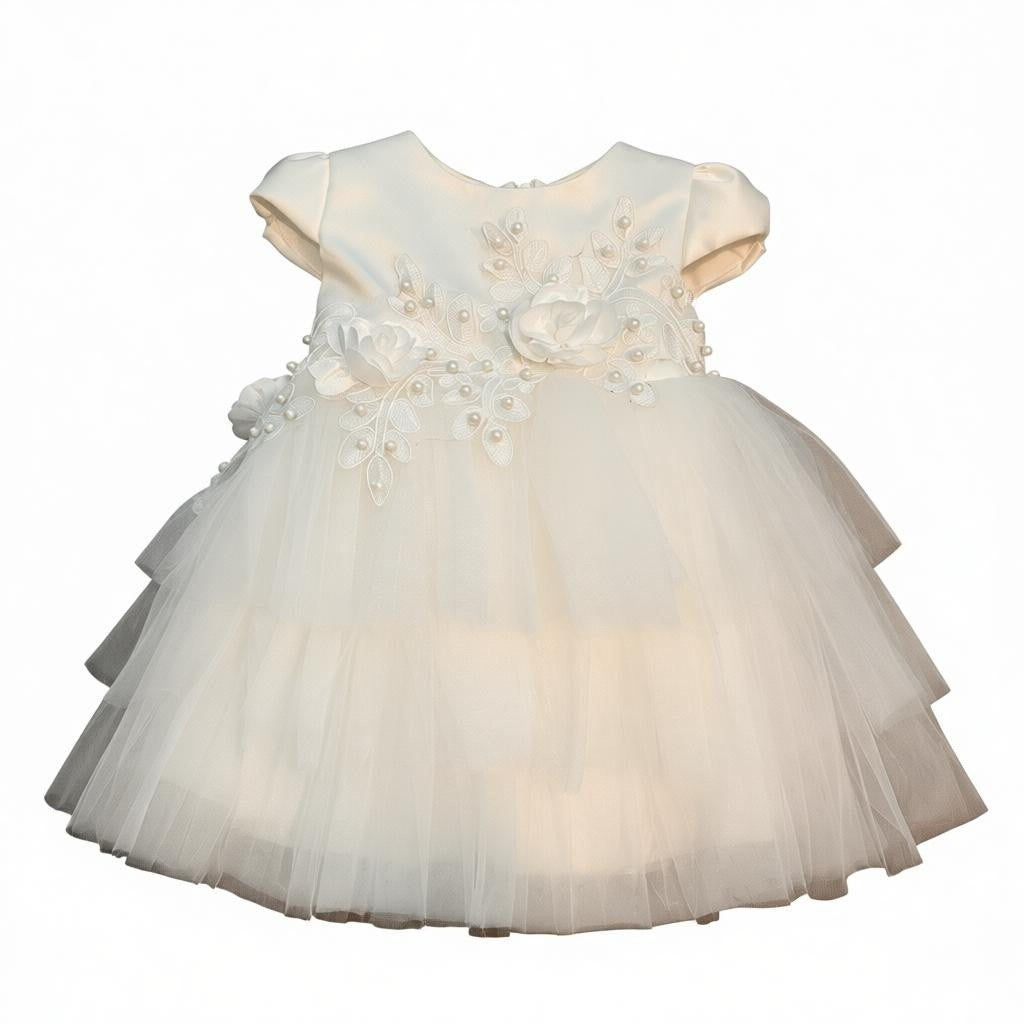 Delicate floral appliqués and elegant details on the bodice add a romantic touch, while the layered tulle skirt creates a light, airy silhouette that’s perfect for all-day comfort.