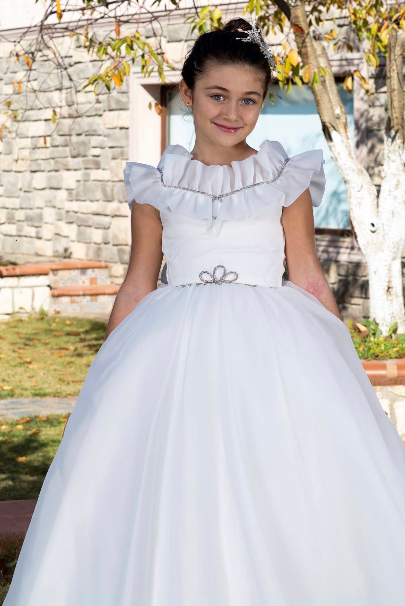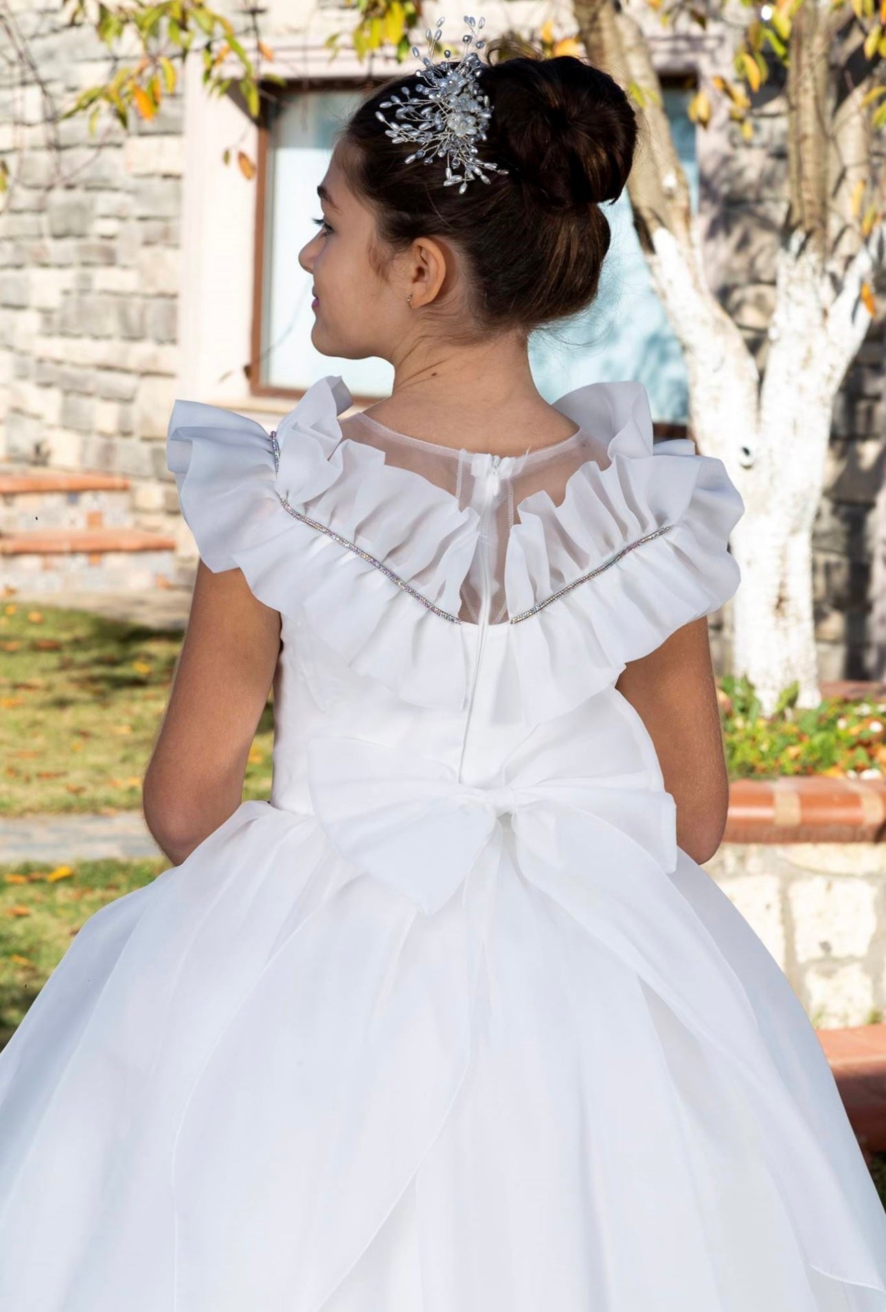 WHITE RUFFLED DRESS WITH STONE DETAILS FOR WEDDINGS COMMUNION AND SPECIAL OCCASIONS