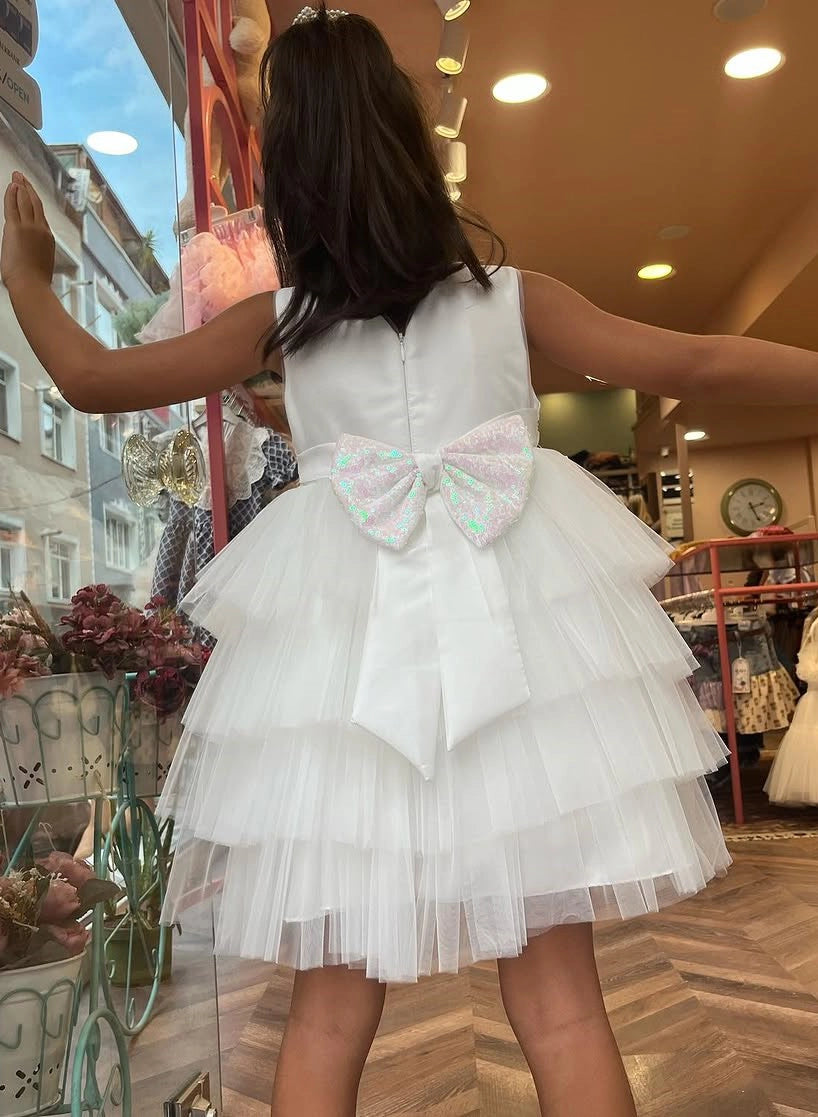 🎀 A striking sequin fabric bow detail at the back, A tiered, voluminous tulle skirt that makes every girl feel like a princess,