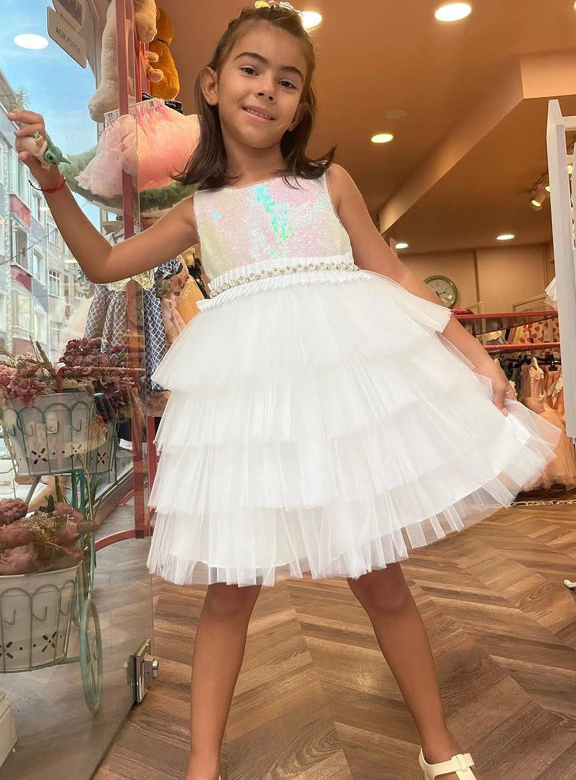 WHITE TULLE SPECIAL OCCASION DRESS WITH SEQUIN DETAIL AND PEARL BELT